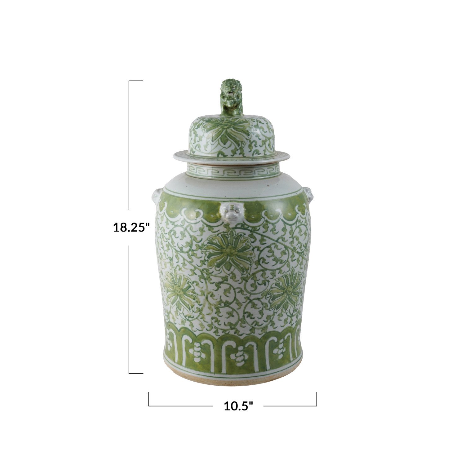 Catalog Name: 10-1/2" Round x 18-1/4"H Decorative Hand-Painted Stoneware Ginger Jar w/ Floral Pattern & Foo Dog, Green & White, Truck Ship