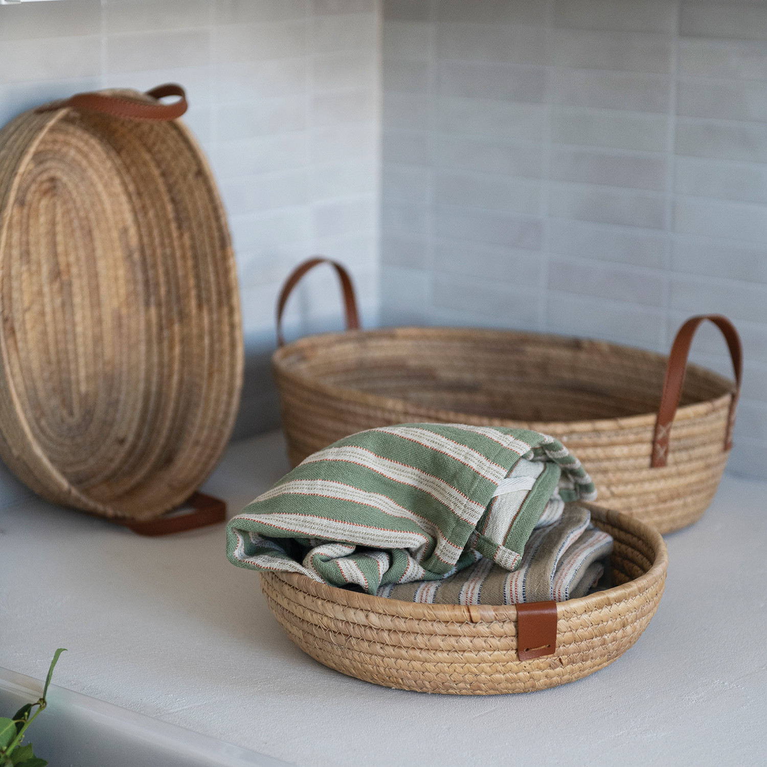 Hand-Woven Seagrass & Water Hyacinth Baskets with Faux Leather Handles, Natural, Set of 2