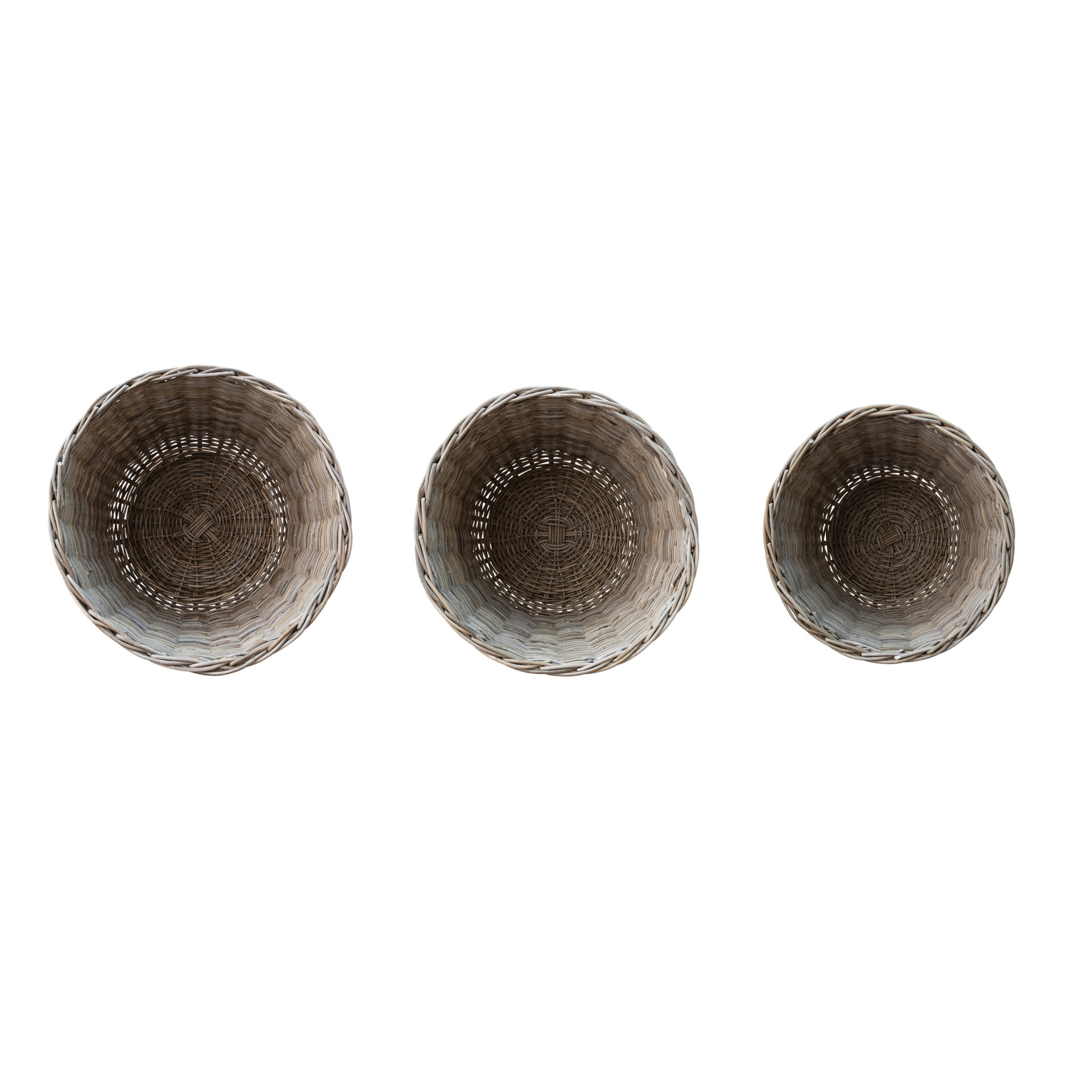 Catalog Name: 32-1/2" Round x 25-1/2"H, 29-1/2" Round x 23-1/2"H & 26-1/2" Round x 21-1/2"H Hand-Woven Rattan Baskets, Grey Washed, Set of 3, Truck Ship
