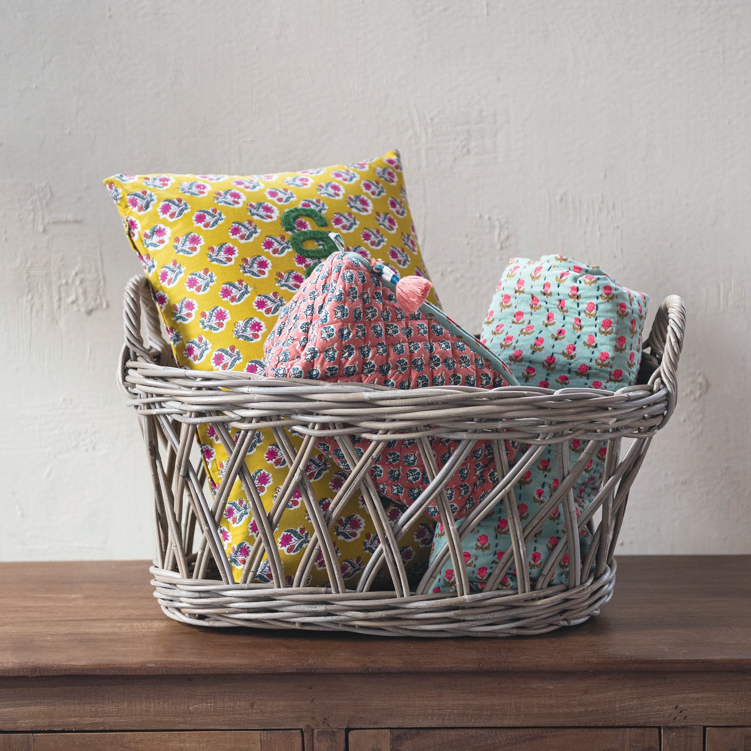 Decorative Hand-Woven Rattan Basket with Handles, Grey Washed