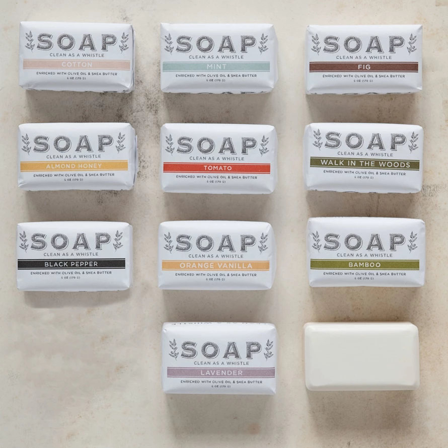 This bar soap is a wonderful addition to any kitchen or bathroom sink. Enriched with olive oil and shea butter, this walk in the woods soap has a distinct fragrance. With beautiful packaging detail, this soap looks lovely next to any home's sink. Leaves hands smelling great.