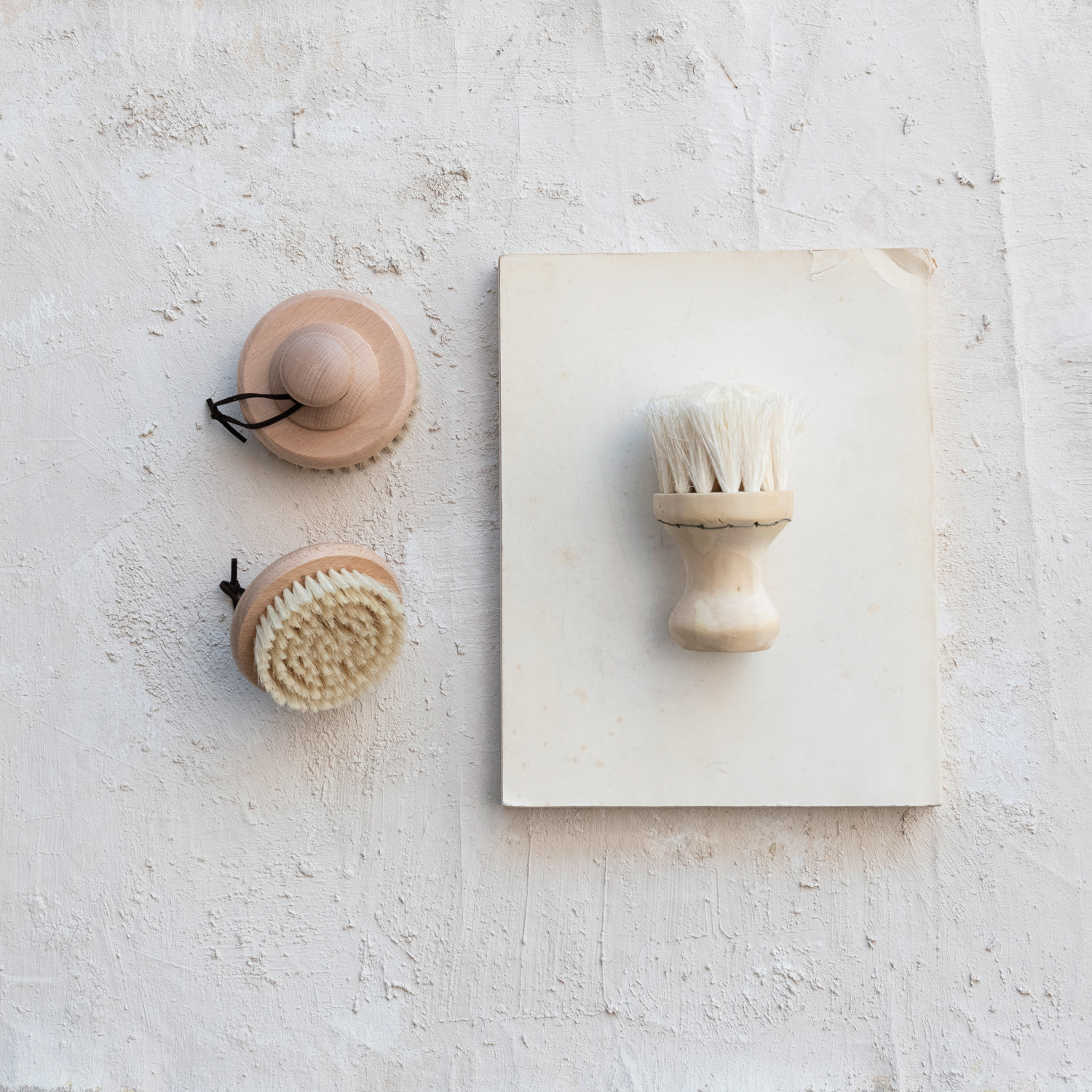 Catalog Name: 4" Round x 2-3/4"H Beech Wood Body Brush w/ Handle & Leather Tie, Natural