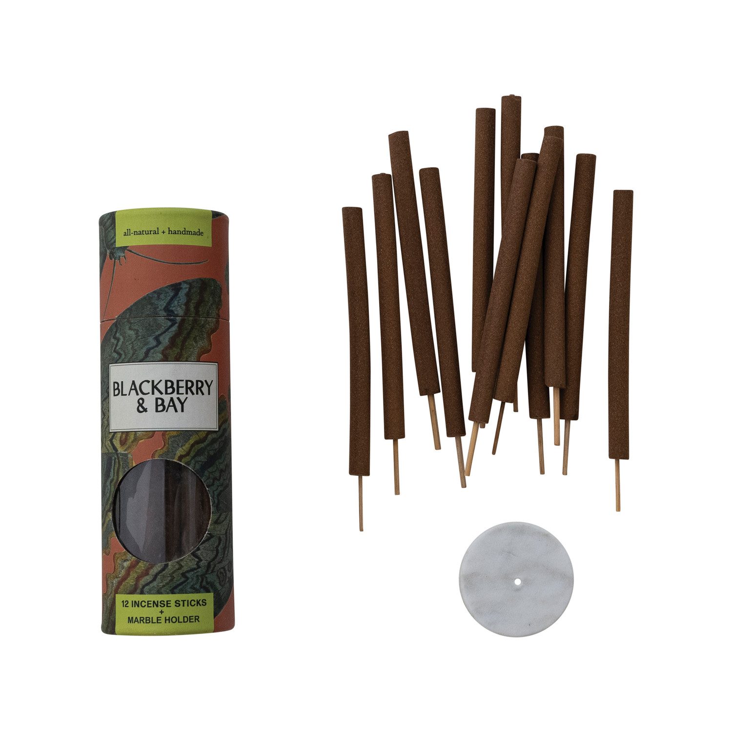 12 Piece Blackberry & Bay Scented Thick Incense Sticks with Marble Incense Holder, Set of 13