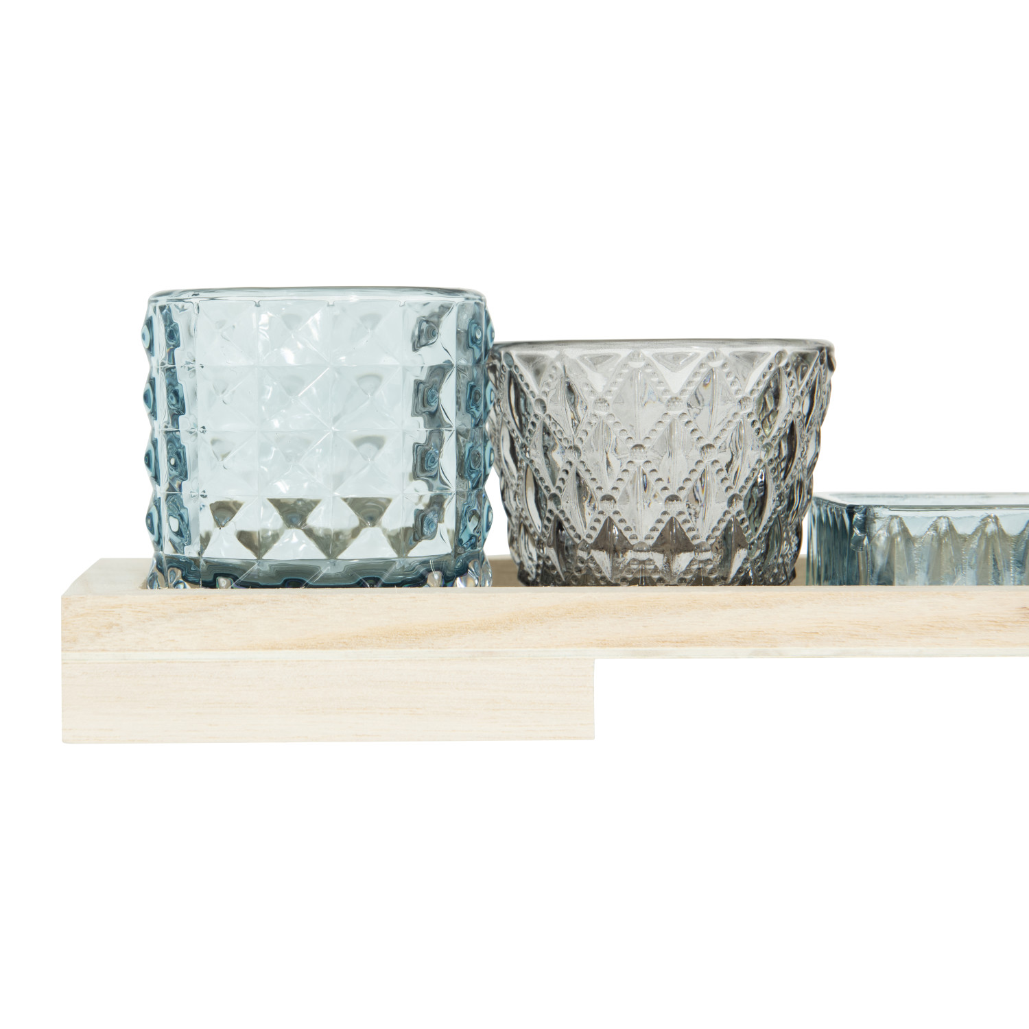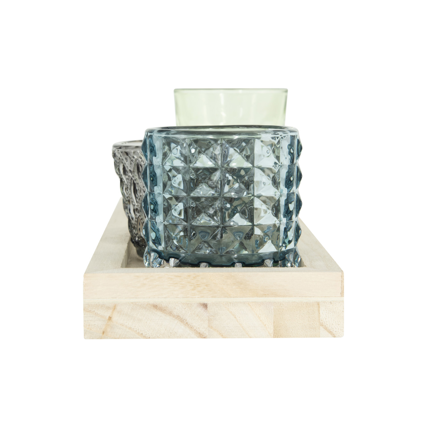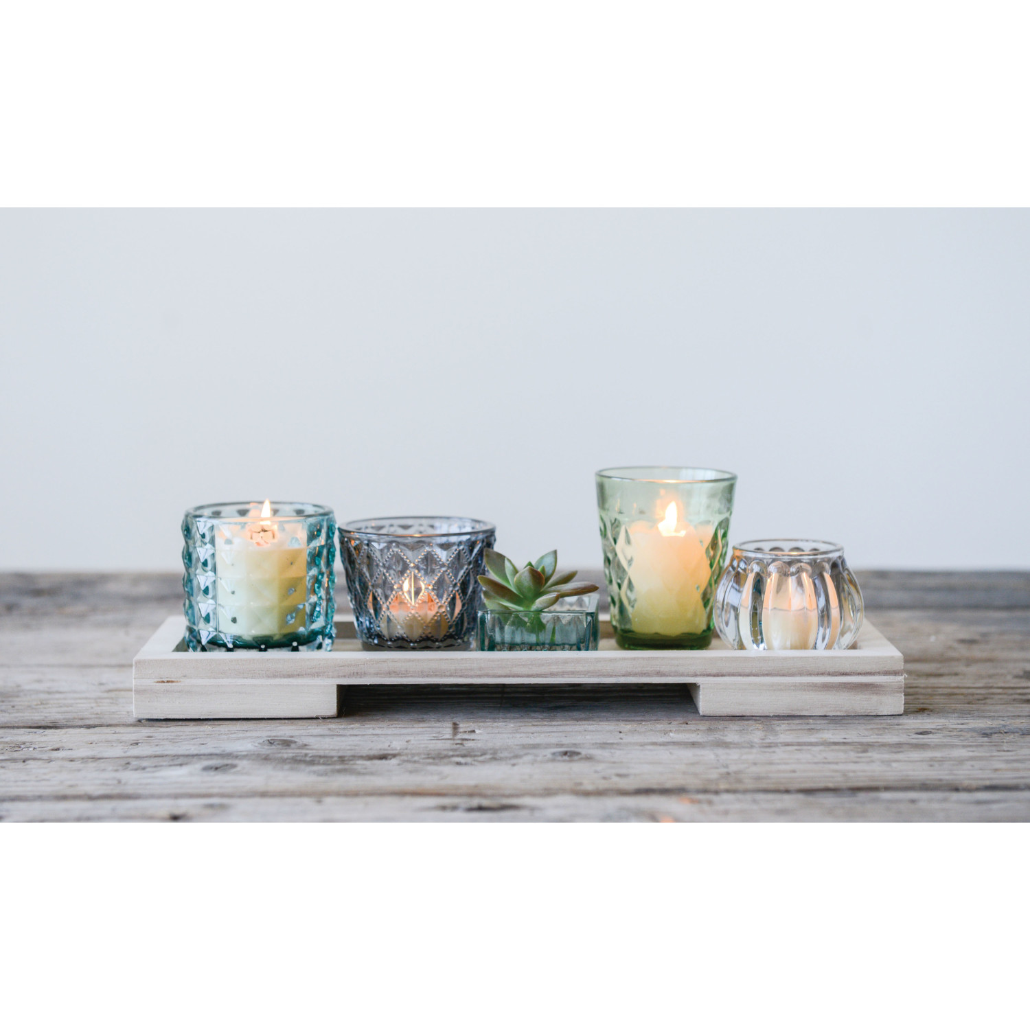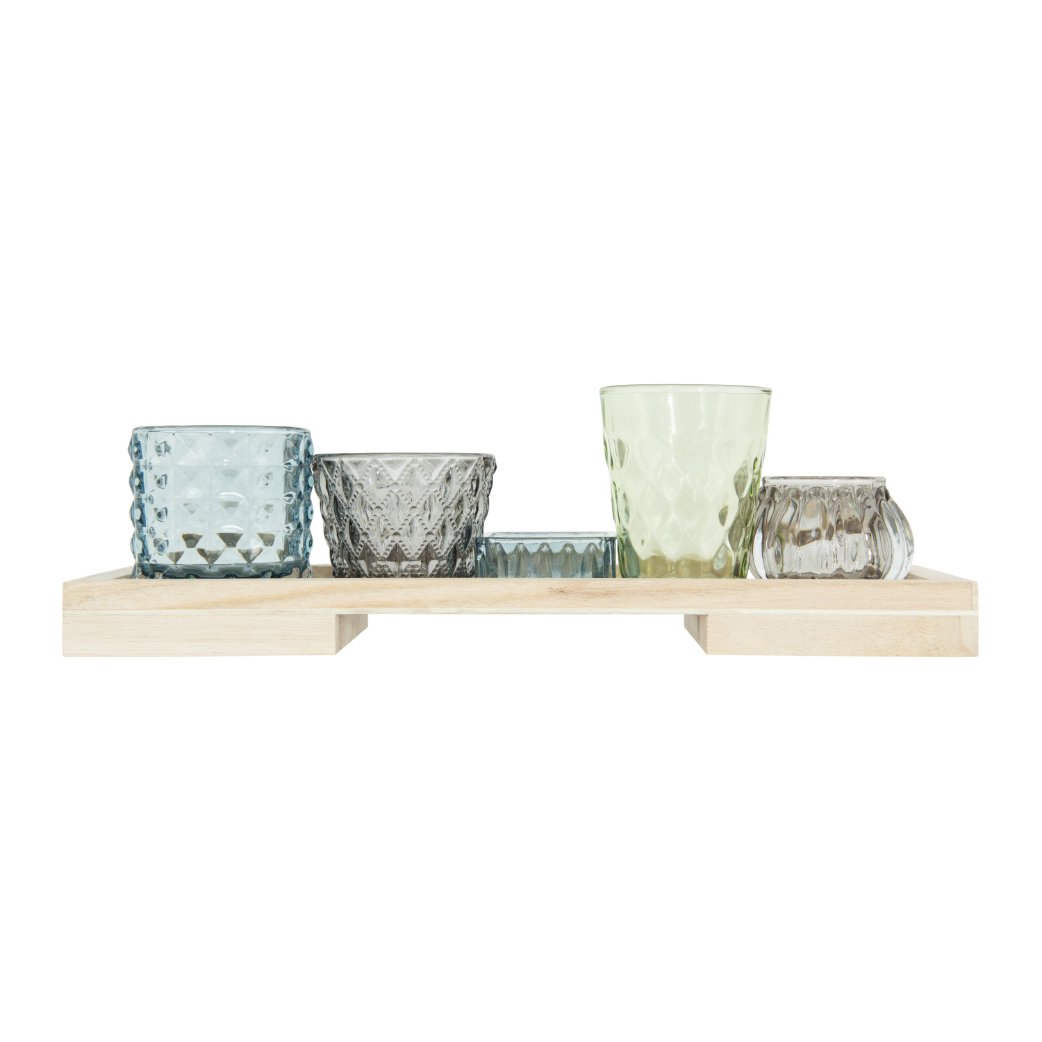 Catalog Name: 13-1/4"L x 4-1/4"W x 4-1/4"H Wood Tray w/ Pressed Glass Tealight/Votive Holders, Multi Color & Natural, Boxed Set of 6