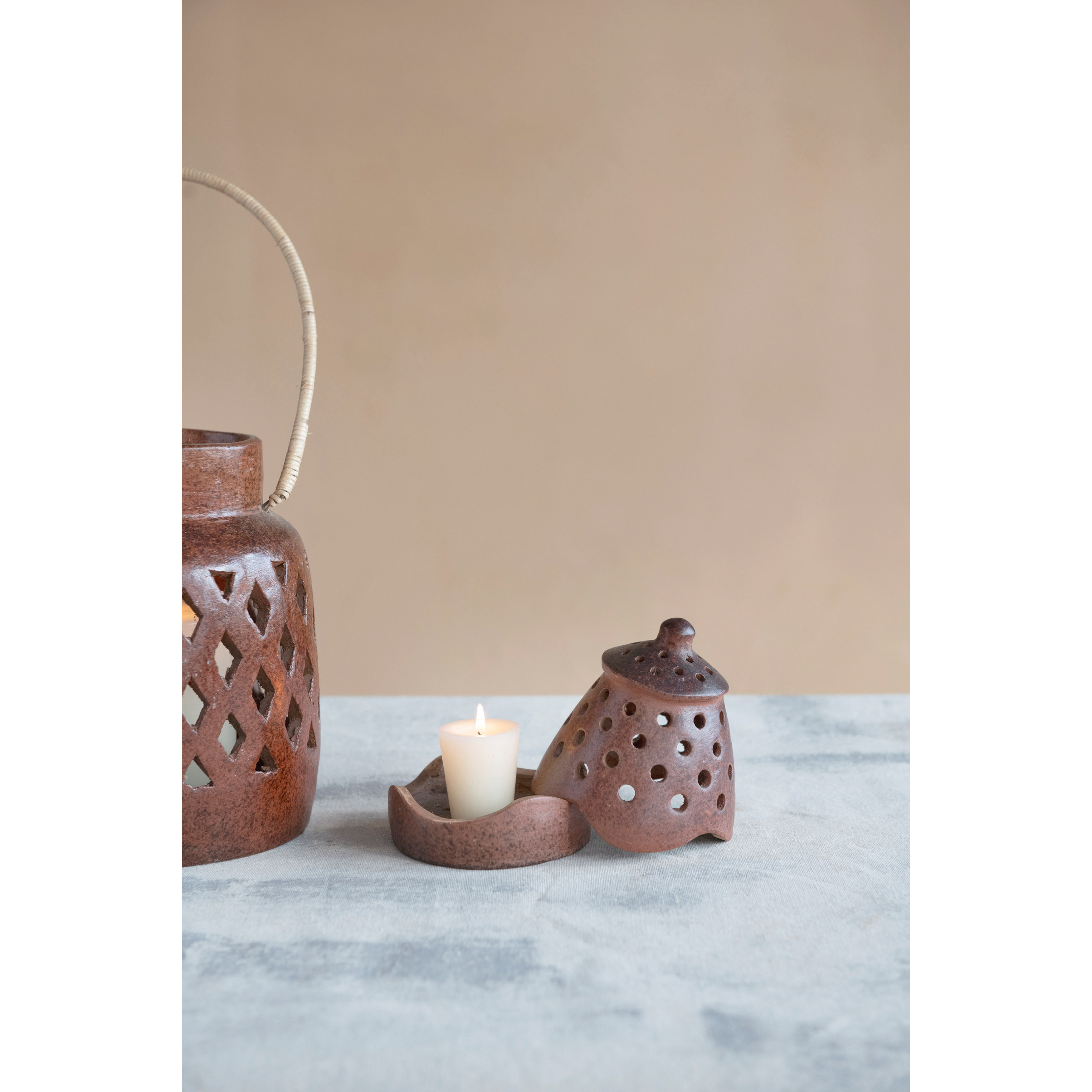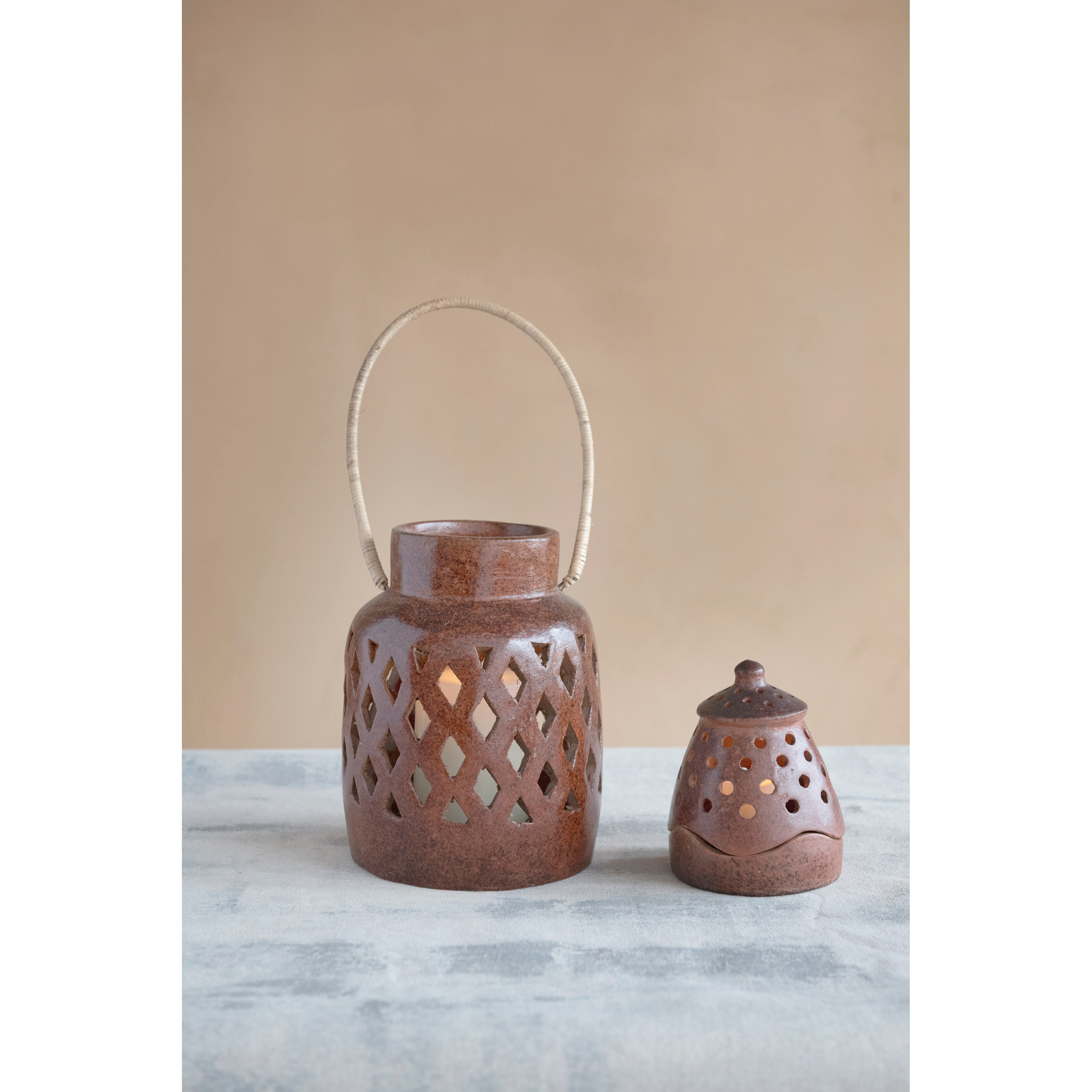 Handmade Terra-cotta Lantern with Cut-Outs and Lid, Reactive Glaze