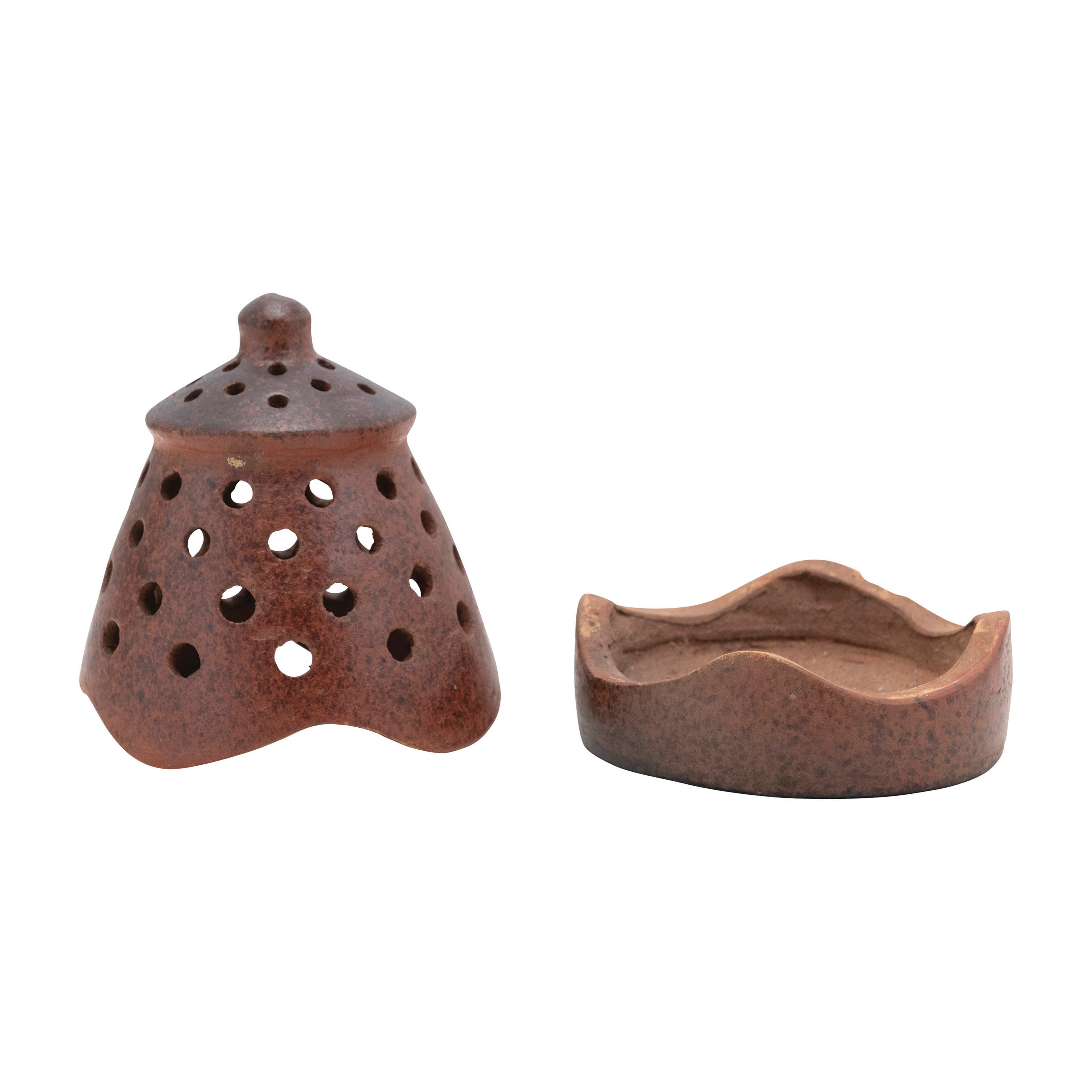 Catalog Name: Approximately 4-1/4" Round x 6"H Handmade Terra-cotta Lantern w/ Cut-Outs & Lid, Reactive Glaze, Brown (Each One Will Vary)