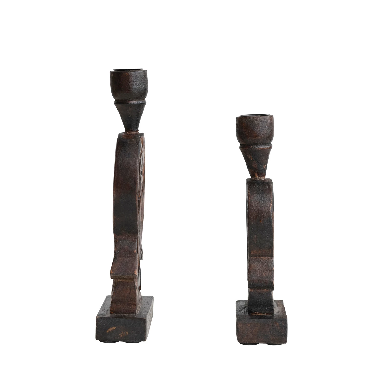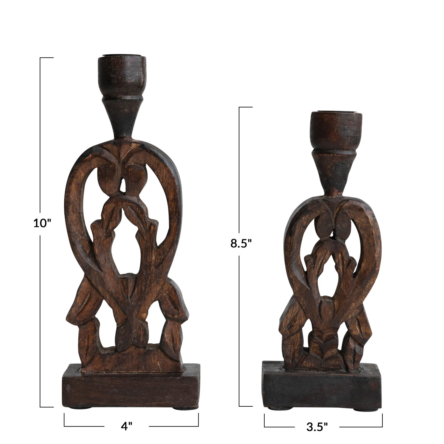 Hand-Carved Mango Wood Taper Holders, Walnut Finish, Set of 2