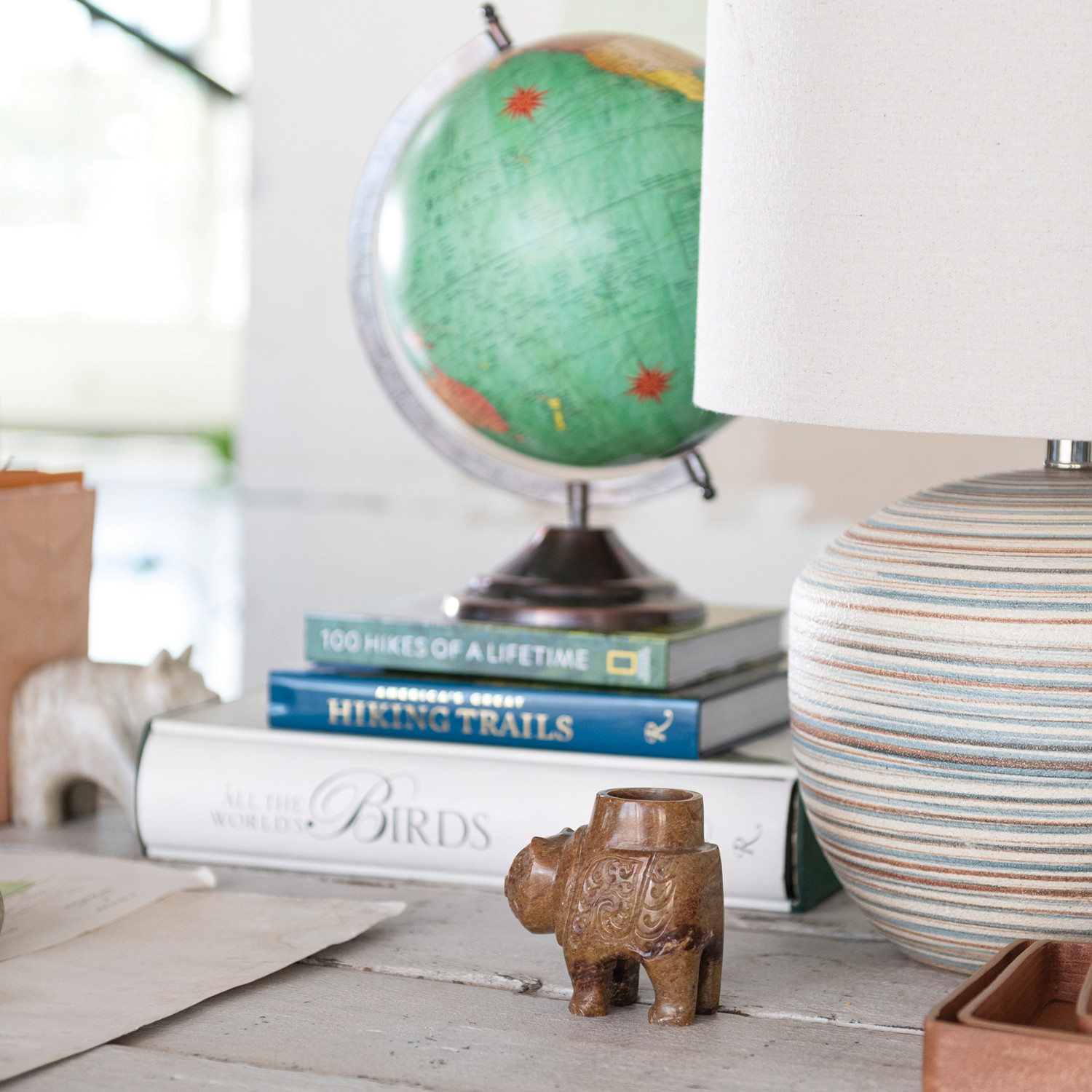 Mix and match the sculptural silhouettes, stylish hues, and unique finishes of our candle and incense holder collection to create the ultimate tablescape. Instantly transform a dining table, dresser, or mantelpiece into a stunning display of ambiance and warmth with carefully chosen bases for a refined candlelight arrangement. Choose from a wide array of materials from iron and marble to wood and stone, and styles from mid-century modern and glam to farmhouse and vintage. From classic taper holders to global-inspired pillar holders and contemporary incense burners and shimmering votives, this collection will create a welcoming atmosphere that is guaranteed to impress. This global-inspired soapstone tealight candleholder showcases the masterfully hand-carved silhouette of a mythical creature. Display in a living space of any style from global to eclectic. Add a touch of personal style to a mantelpiece or shelfscape with this candle holder. Made from soapstone.