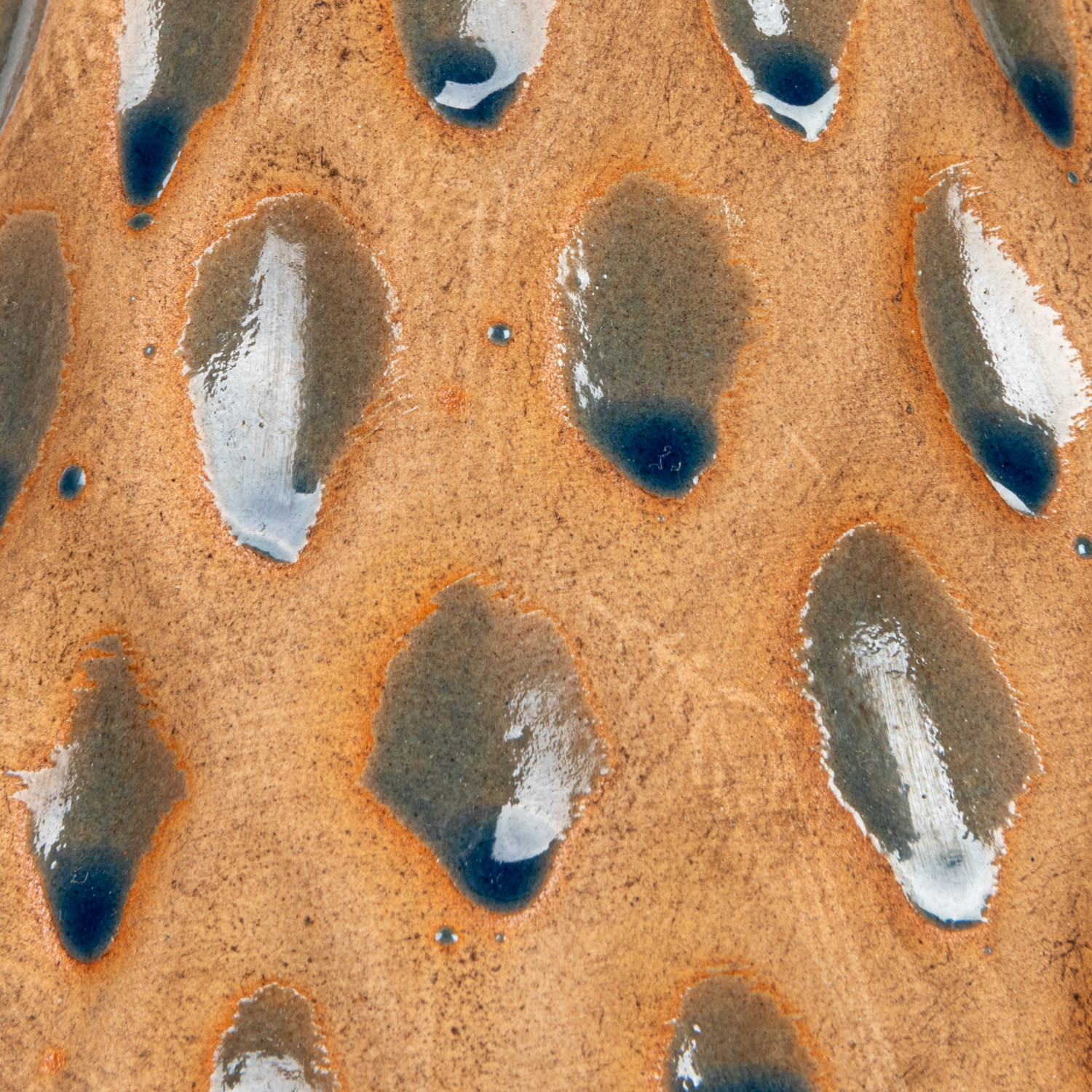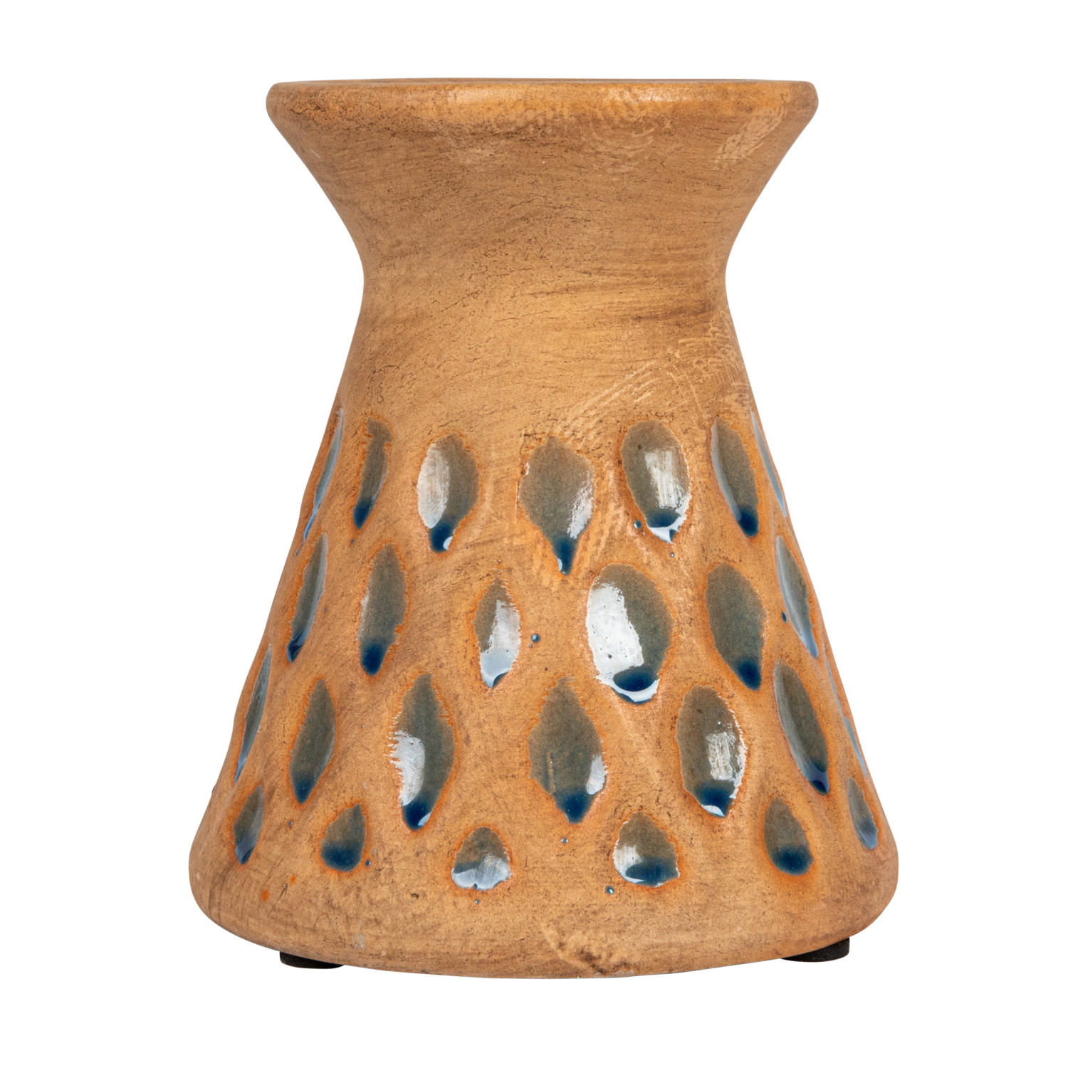Elegant and versatile, the candle holders offered are more than mere accessories; they serve as expressions of one's style and mood. Crafted from various materials such as metal, glass, and stoneware, these candle holders boast a range of designs that effortlessly complement any decor. With the ability to accommodate an array of candle types, from tea lights to pillars, they prove to be both user-friendly and easy to maintain. Intended for use in any room where the soothing radiance of candles is desired, these holders are thoughtfully designed to elevate the ambiance and create a captivating atmosphere. Whether aiming to cultivate a romantic, cozy, or festive setting, these candle holders are well-equipped to assist. Browse through the exquisite collection to discover the perfect pieces that will illuminate space with elegance and charm. With these candle holders, the home or event will be transformed into a captivating haven. Illuminate any space with the enchanting beauty of this debossed terra-cotta candle pillar holder with natural and blue tones intertwining on the textured surface, creating a captivating visual display. Complements various interior design styles, from rustic and coastal to bohemian and eclectic. The holder is designed specifically for 3-inch pillar candles, providing a secure and stylish platform for showcasing any favorite candles. Made of terra-cotta.