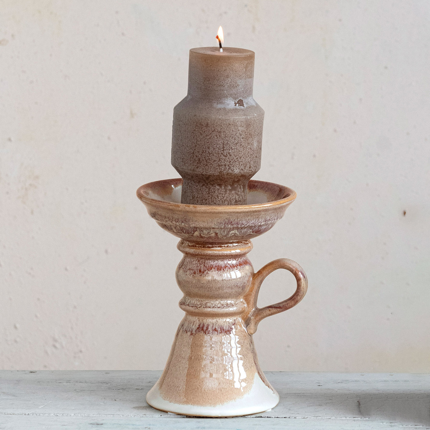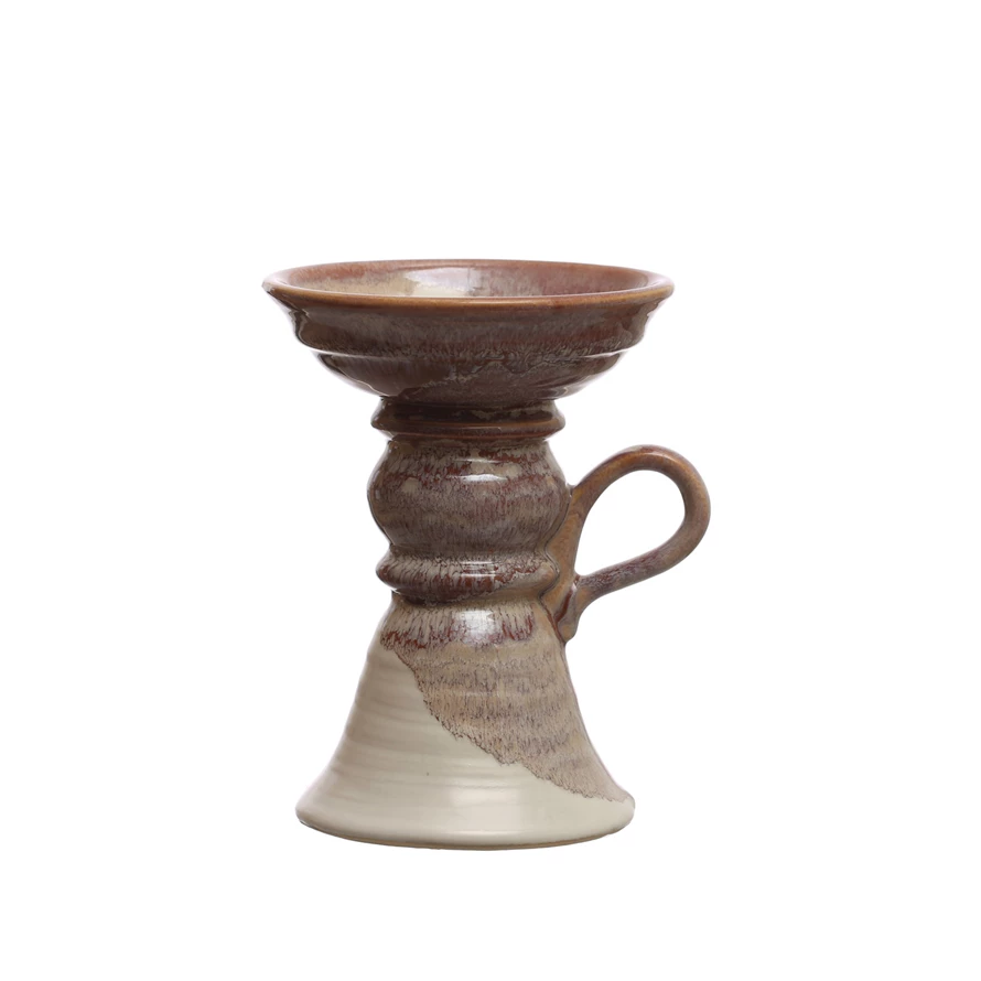 Stoneware Pillar Holder w/ Handle (Holds 5" Pillar) (Each One Will Vary)