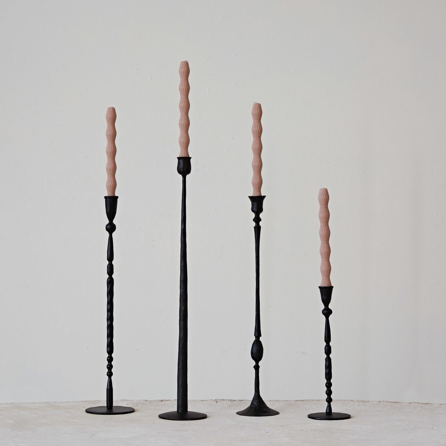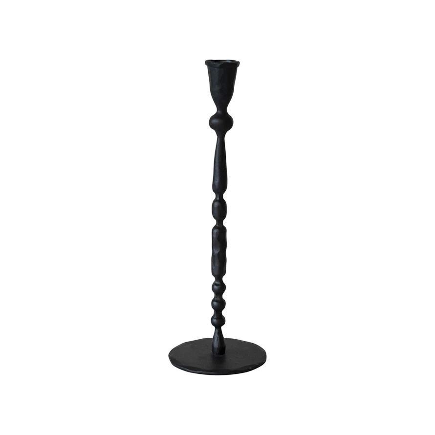 This taper holder is a beautiful and functional piece that will enhance the home with its rustic charm. The taper holder is hand-forged metal, shaped, and hammered by skilled artisans. The metal has a black finish that adds contrast and depth to the space. The taper holder has a round base and a slender stem that can hold most standard taper candles. Place this on any surface or setting, creating a cozy and inviting ambiance with its subtle light. Whether used for decoration or illumination, this taper holder will add a touch of sophistication and simplicity to the space. It measures 3.75 inches in diameter and 12 inches in height, suitable for holding most standard taper candles. This candle holder is the perfect way to add color and charm to any room.