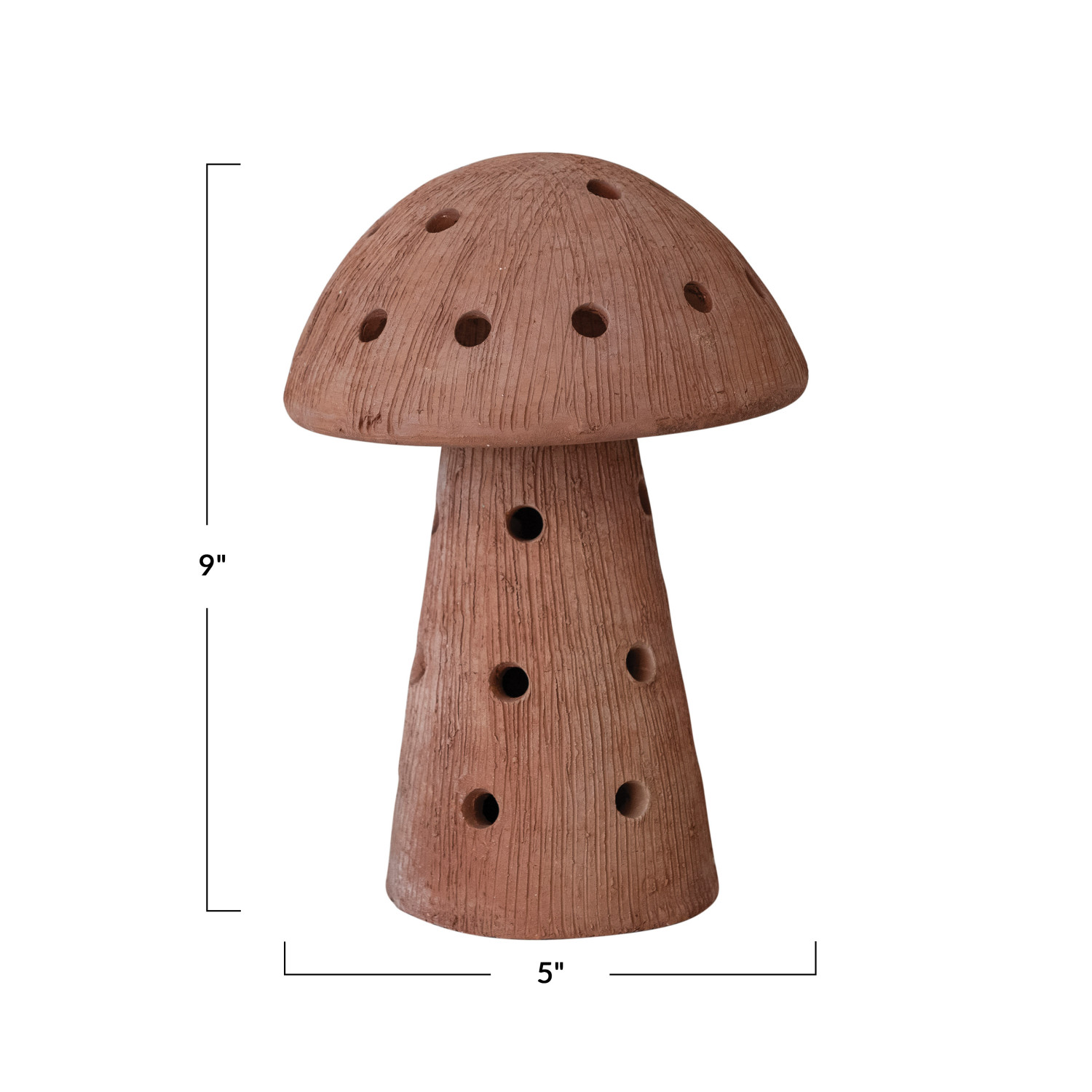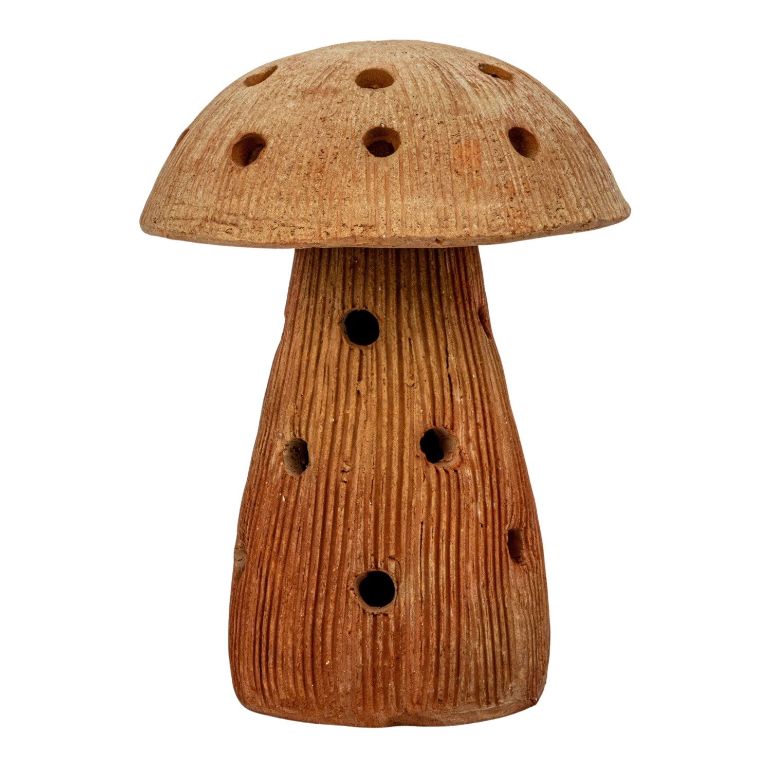 Add some personality and enchantment to the home with this handmade vintage reproduction terra-cotta mushroom shaped candle holder. This lovely piece showcases a handmade vintage reproduction terra-cotta base in a mushroom shape with cut-outs and a natural color that adds a touch of warmth and originality. The candle holder can hold one pillar candle (not included) that will illuminate the space with a soft and inviting glow. The candle holder is made of terra-cotta and paper mâché that are eco-friendly and durable. Each one will vary slightly due to the handmade nature of the item. Whether used for everyday or special occasions, this candle holder will enhance the decor and mood.