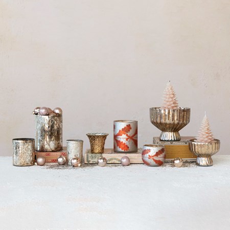Catalog Name: 4" Round x 4"H Glass Tealight/Votive Holder w/ Embossed Rubber Band Circles, Metallic Finish