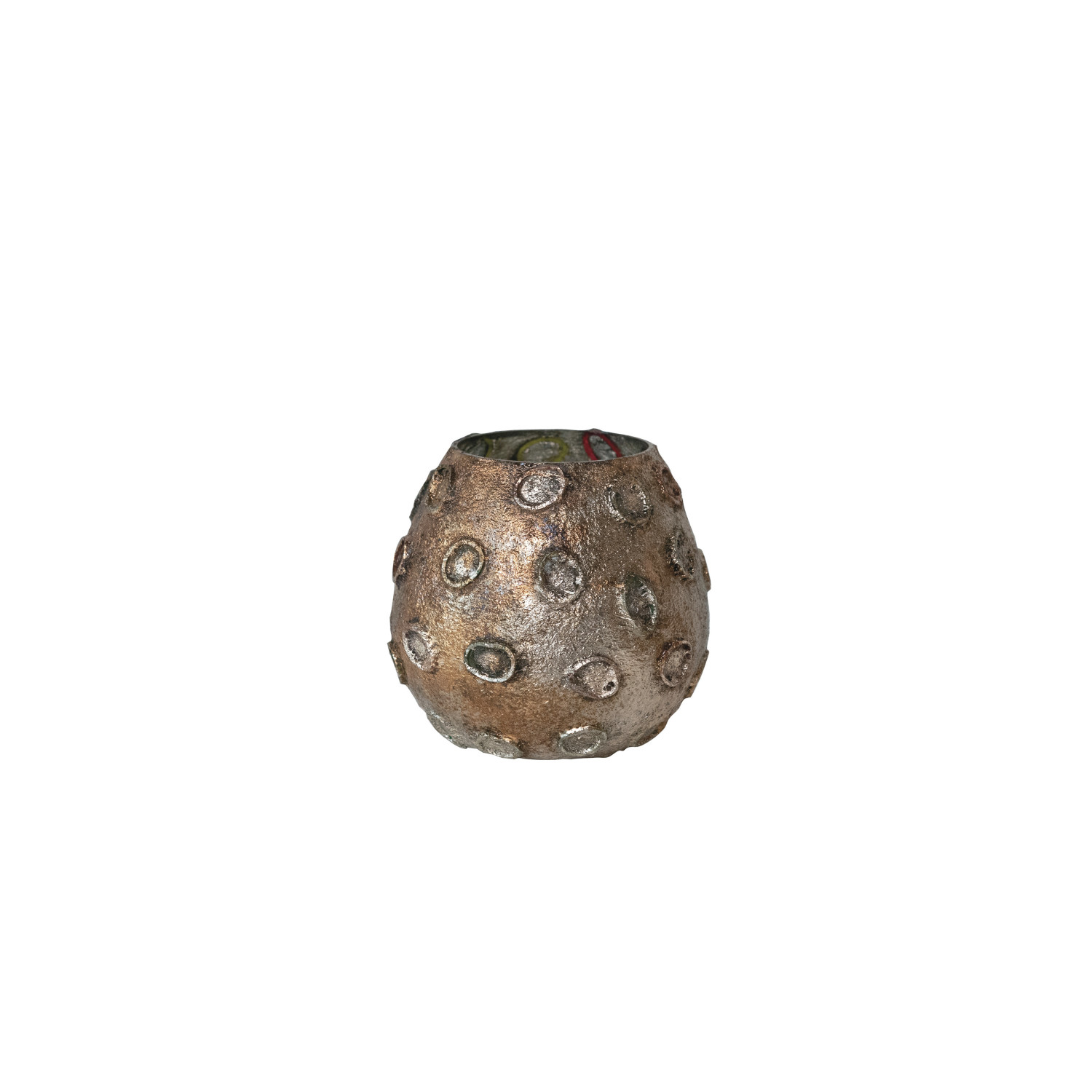Catalog Name: 4" Round x 4"H Glass Tealight/Votive Holder w/ Embossed Rubber Band Circles, Metallic Finish