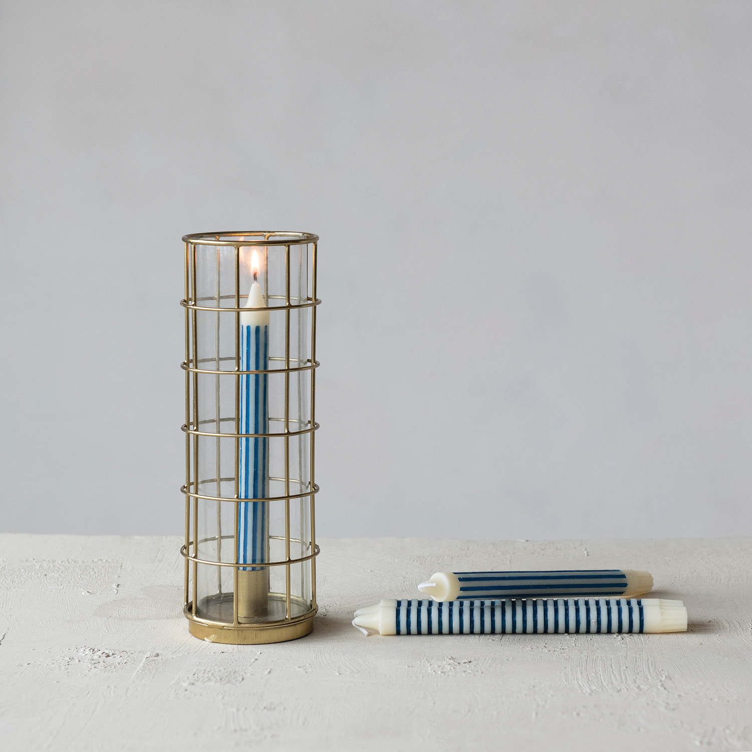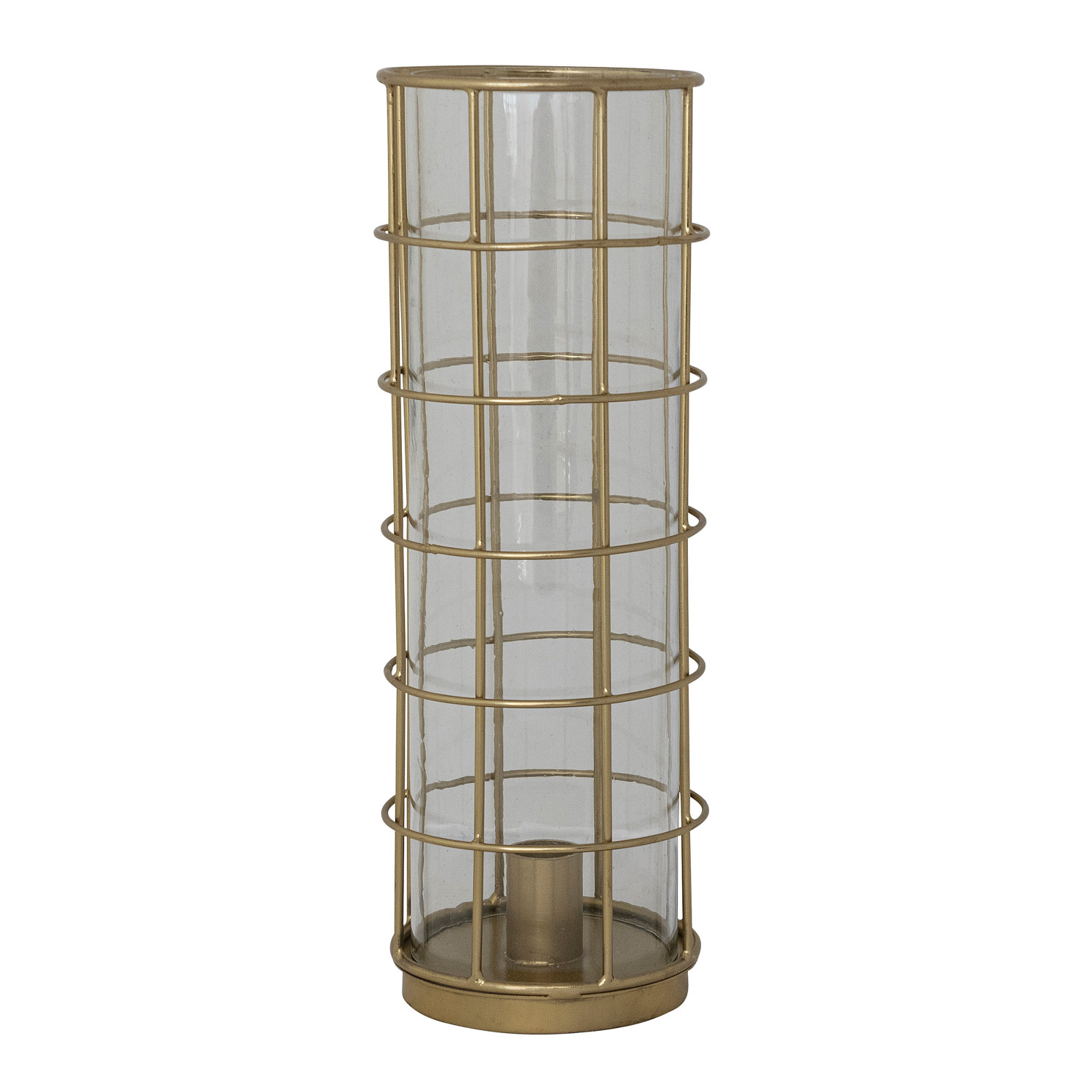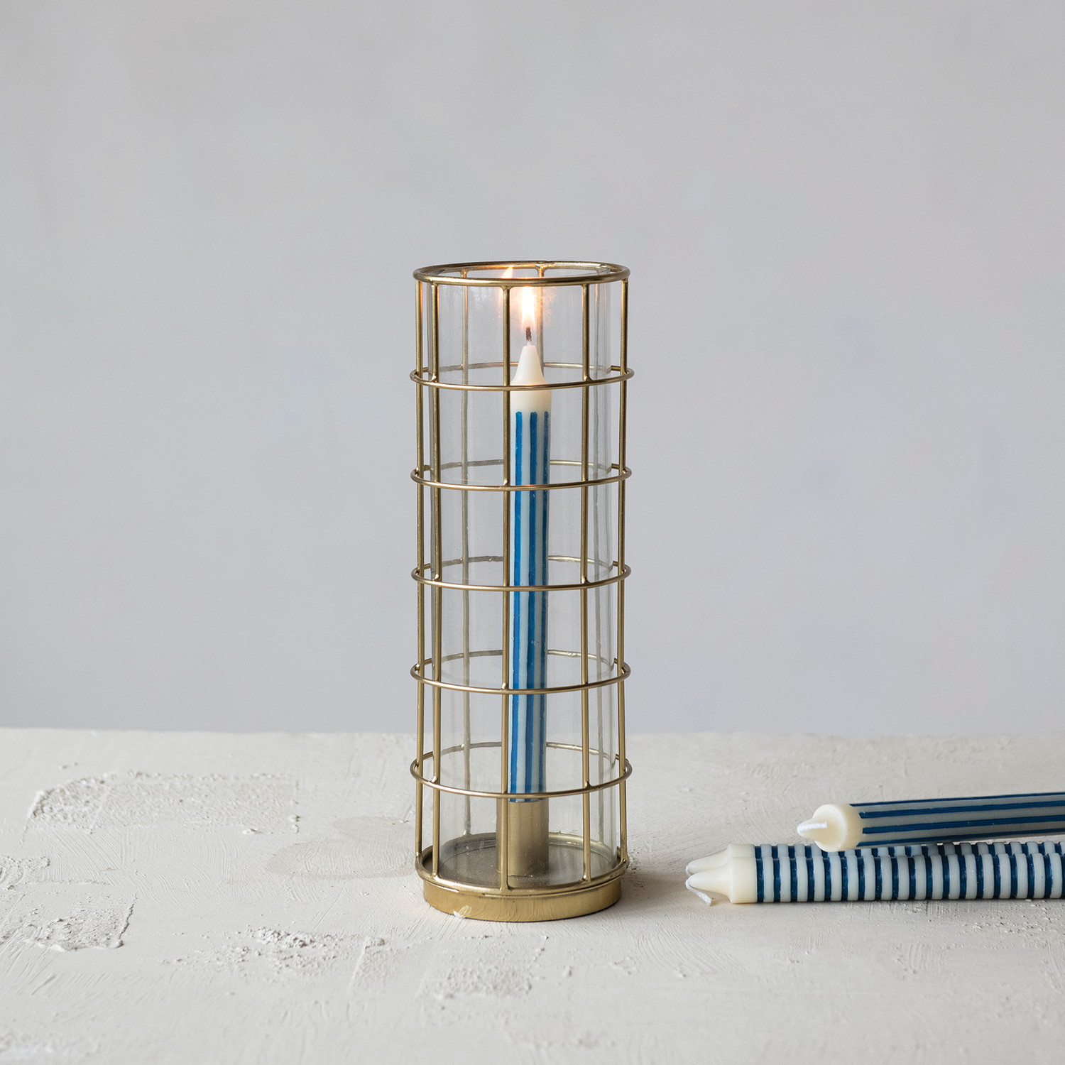 Metal Taper Holder in Metal Cage with Glass Hurricane, Gold Finish