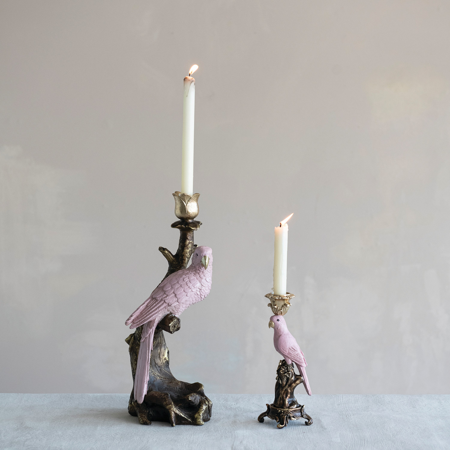 Resin Taper Holder with Parrot on Branch, Antique Gold Finish & Pink