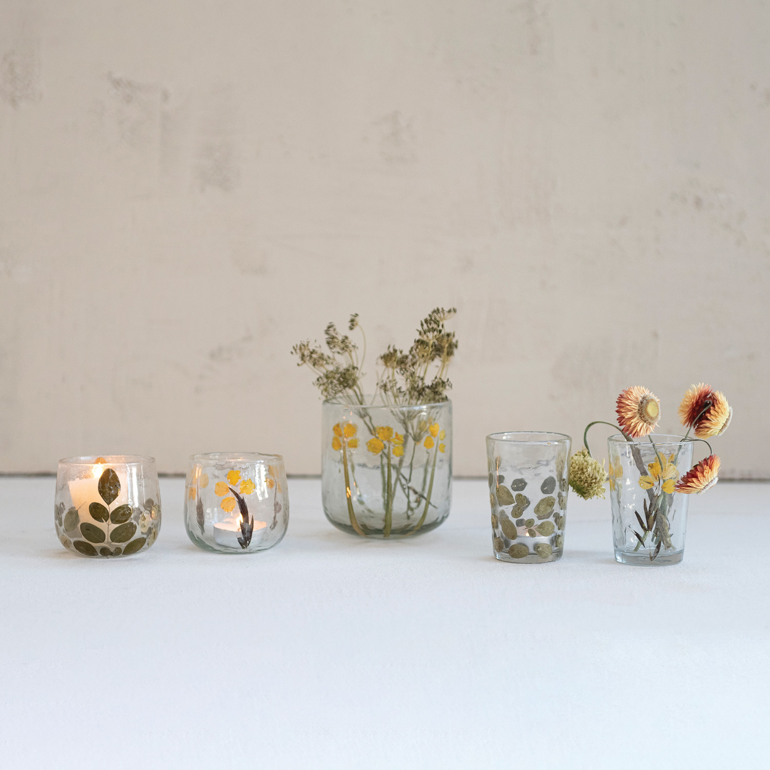 Handmade Glass Tealight/Votive Holder with Embedded Natural Silk Oak Leaves