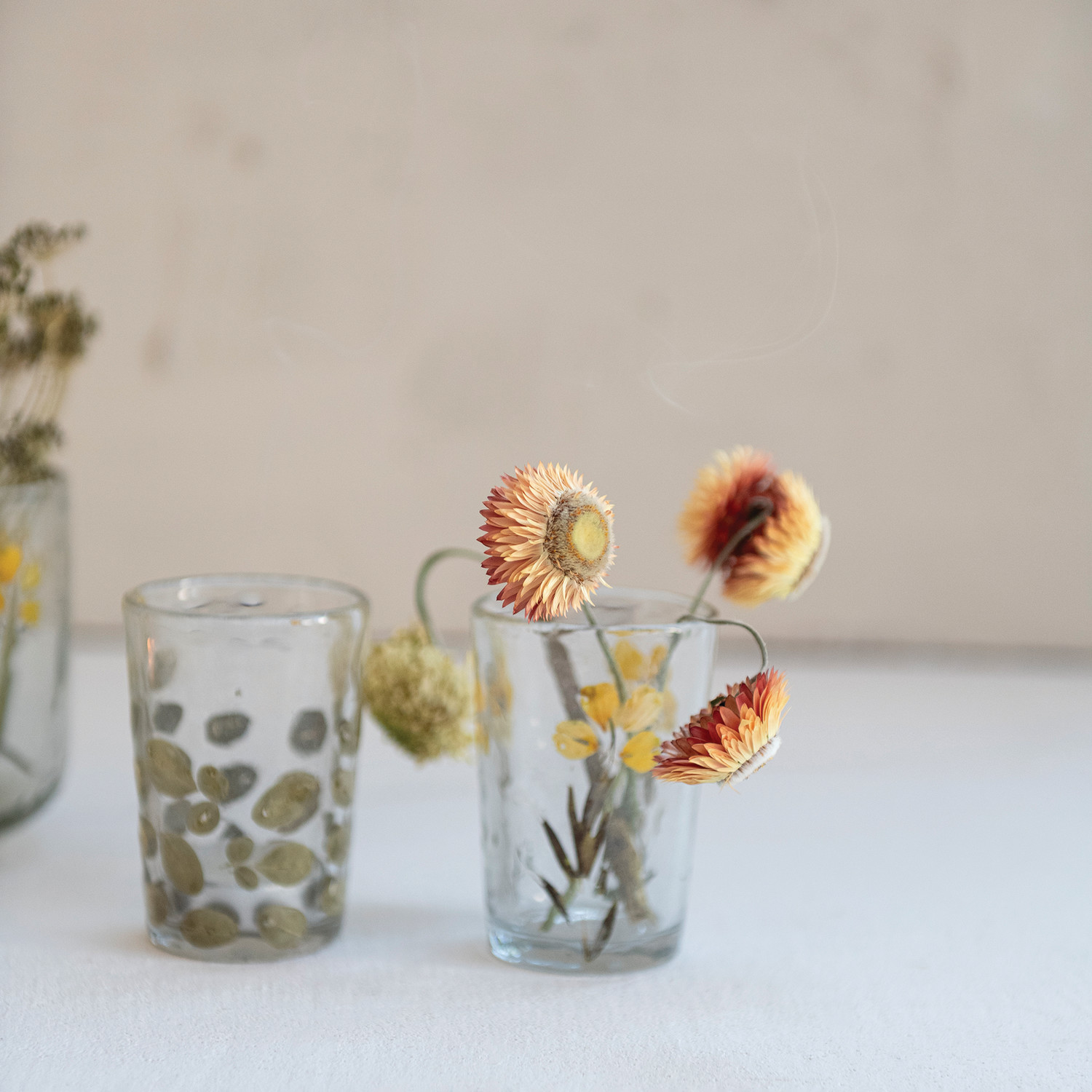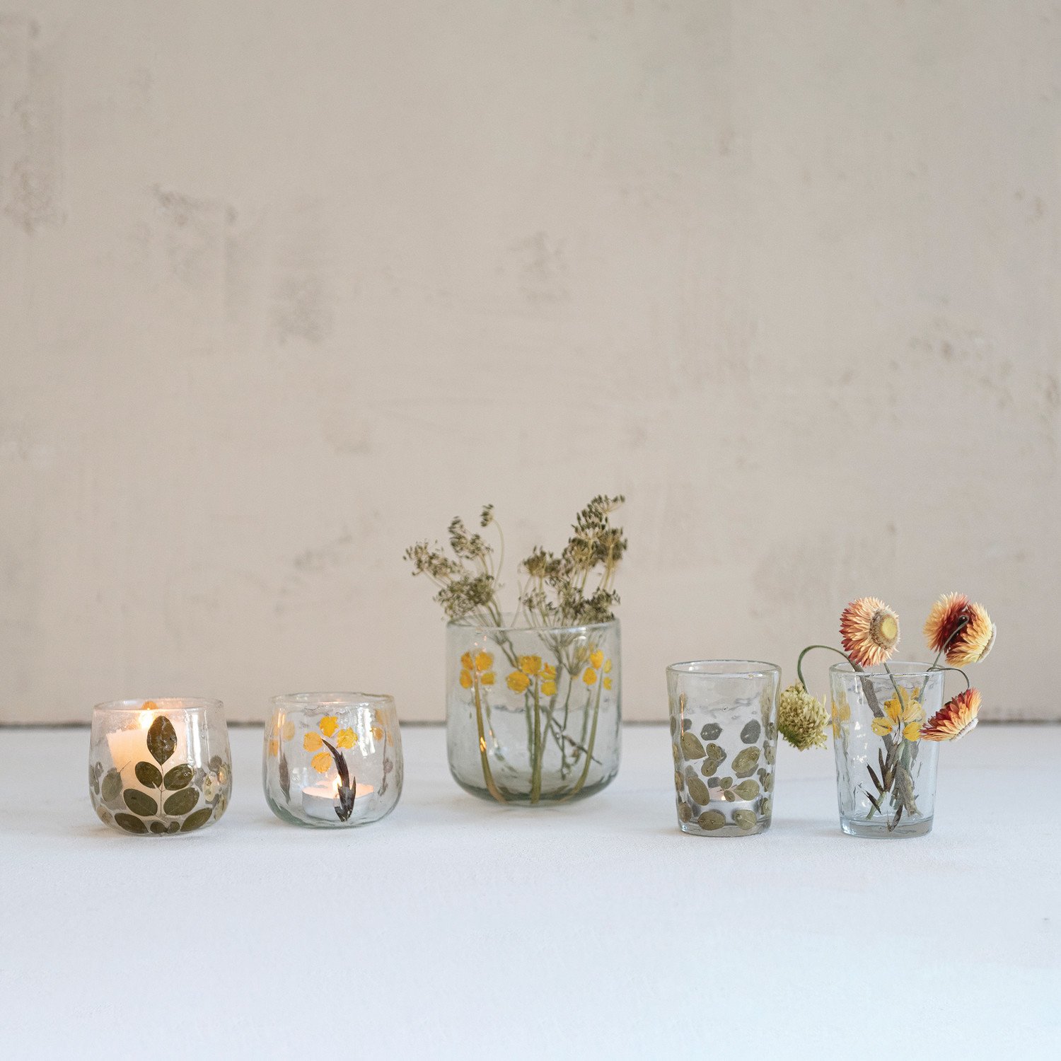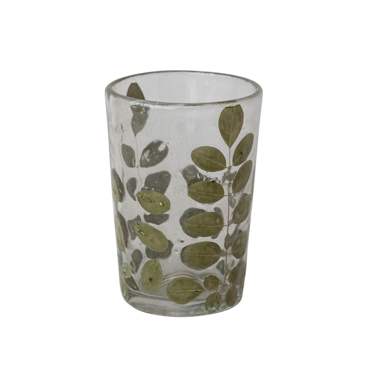 Catalog Name: 2-1/2" Round x 3-1/2"H Handmade Glass Tealight/Votive Holder w/ Embedded Natural Moringa Leaves