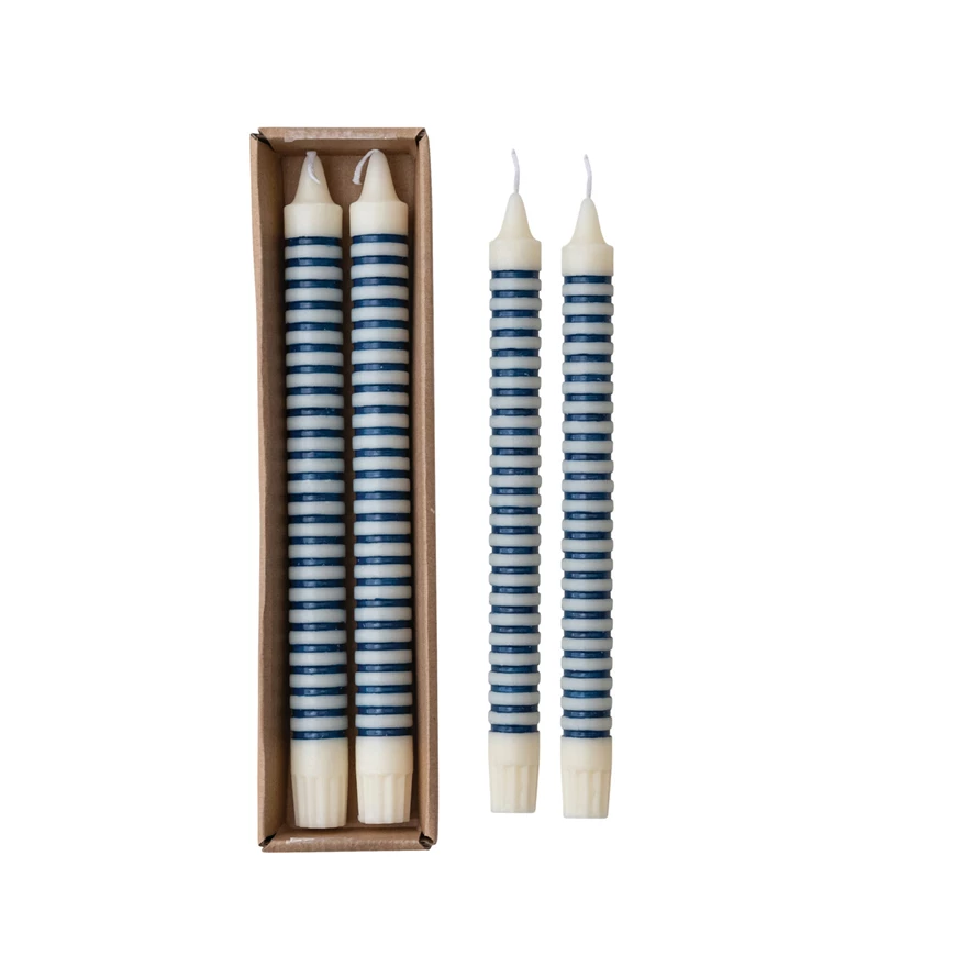 Catalog Name: 10"H Unscented Striped Taper Candles in Box, Blue, Set of 2 (Est. Burn Time 6 Hours)