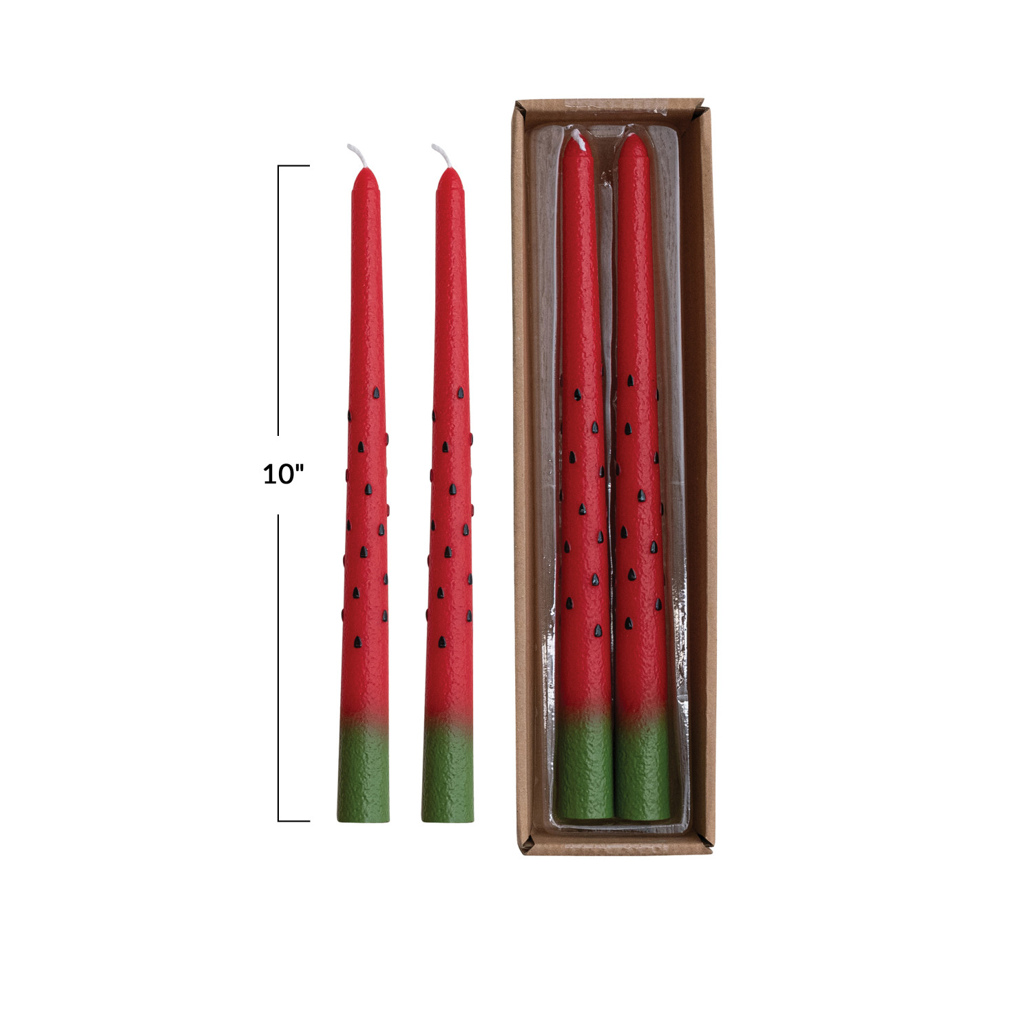 Catalog Name: 10"H Unscented Watermelon Pattern Taper Candles in Box, Red & Green, Set of 2 (Est. Burn Time 5 Hours)