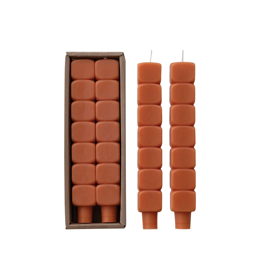 Unscented Stacked Blocks Shaped Taper Candles in Box, Rust Color, Set of 2