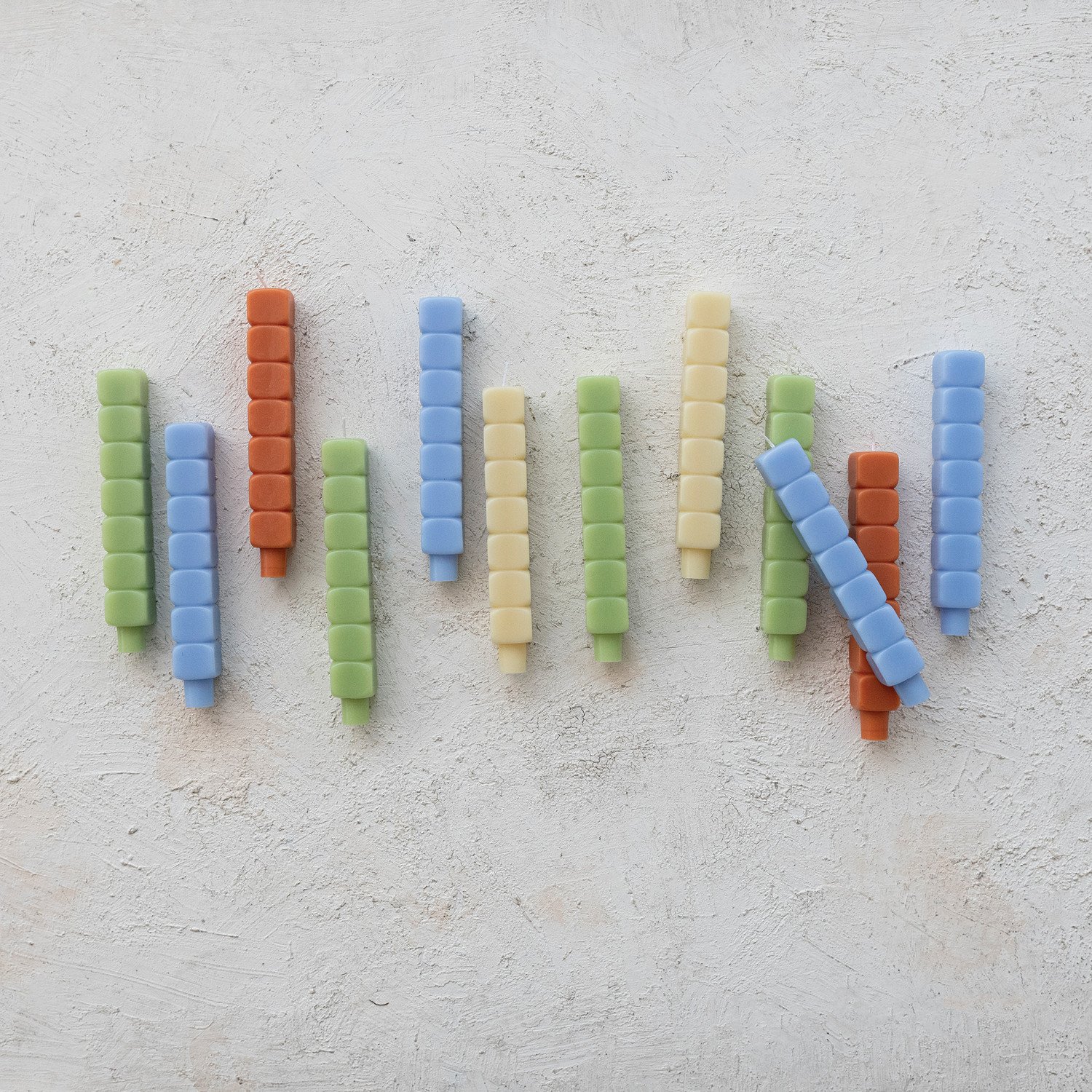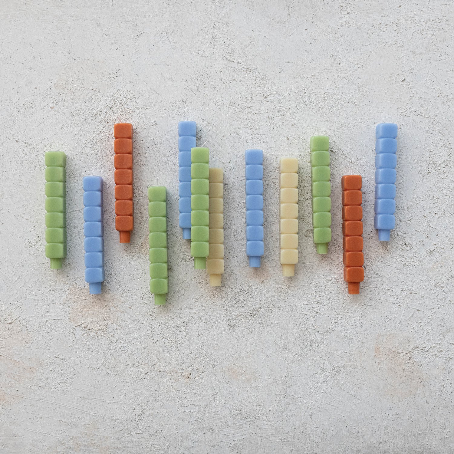 Catalog Name: 8"H Unscented Stacked Blocks Shaped Taper Candles in Box, Blue, Set of 2 (Est. Burn Time 12 Hours)