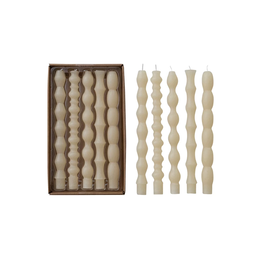 Catalog Name: 10"H Unscented Taper Candles in Box, Cream Color, Set of 5 (Est. Burn Time 8 Hours)