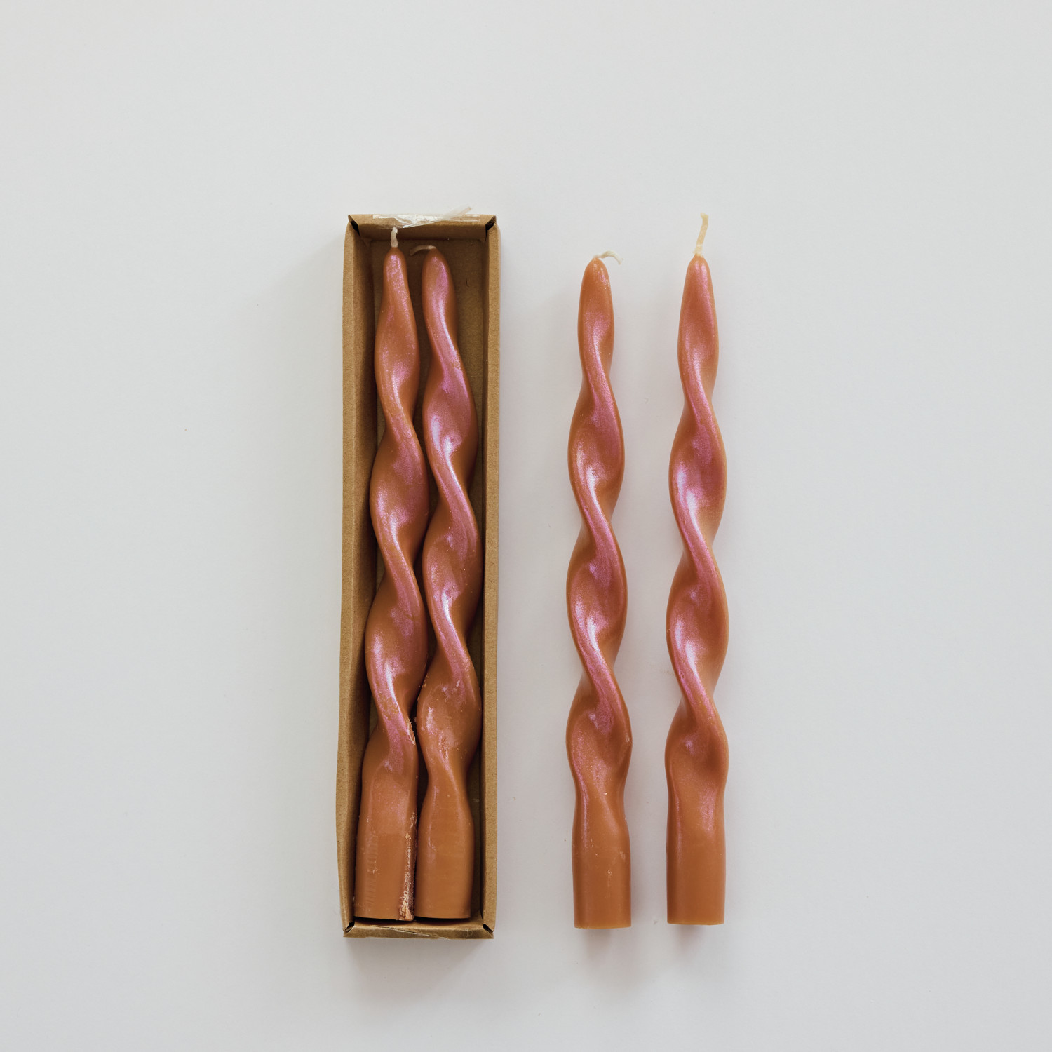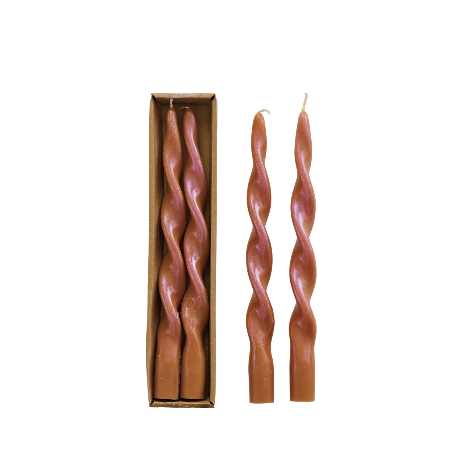 Catalog Name: 10"H Unscented Twisted Taper Candles in Box, Iridescent Rainbow Finish, Brown Sugar Color, Set of 2 (Est. Burn Time 6 Hours)