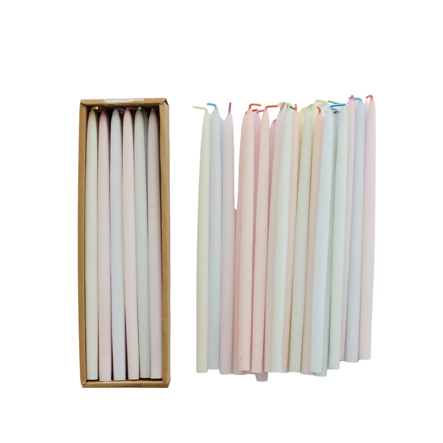 Unscented Thin Taper Candles with Multi Color Wick in Box, Pastel Multi Color, Set of 24