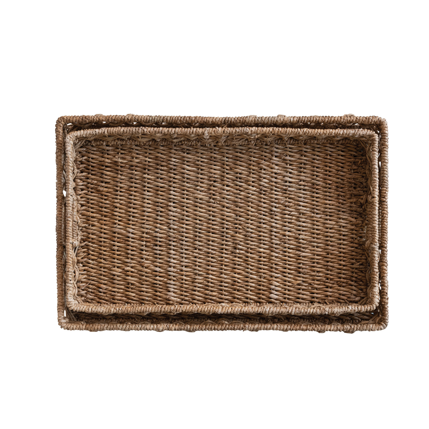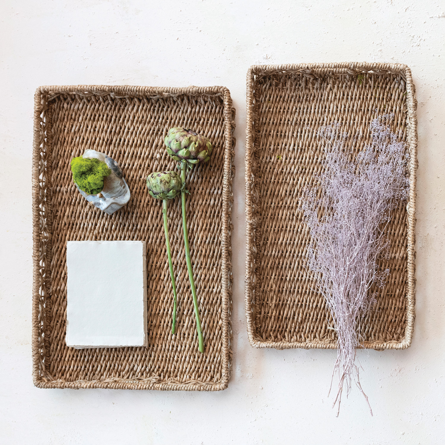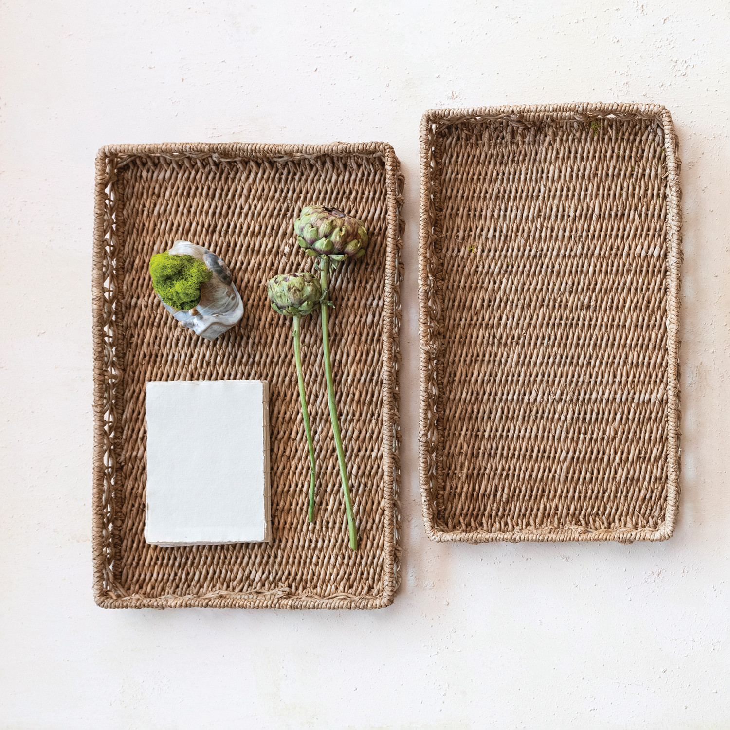 Catalog Name: 28"L x 18"W x 3"H & 25-1/2"L x 15"W x 3"H Decorative Hand-Woven Water Hyacinth & Rattan Trays w/ Handles, Natural, Set of 2