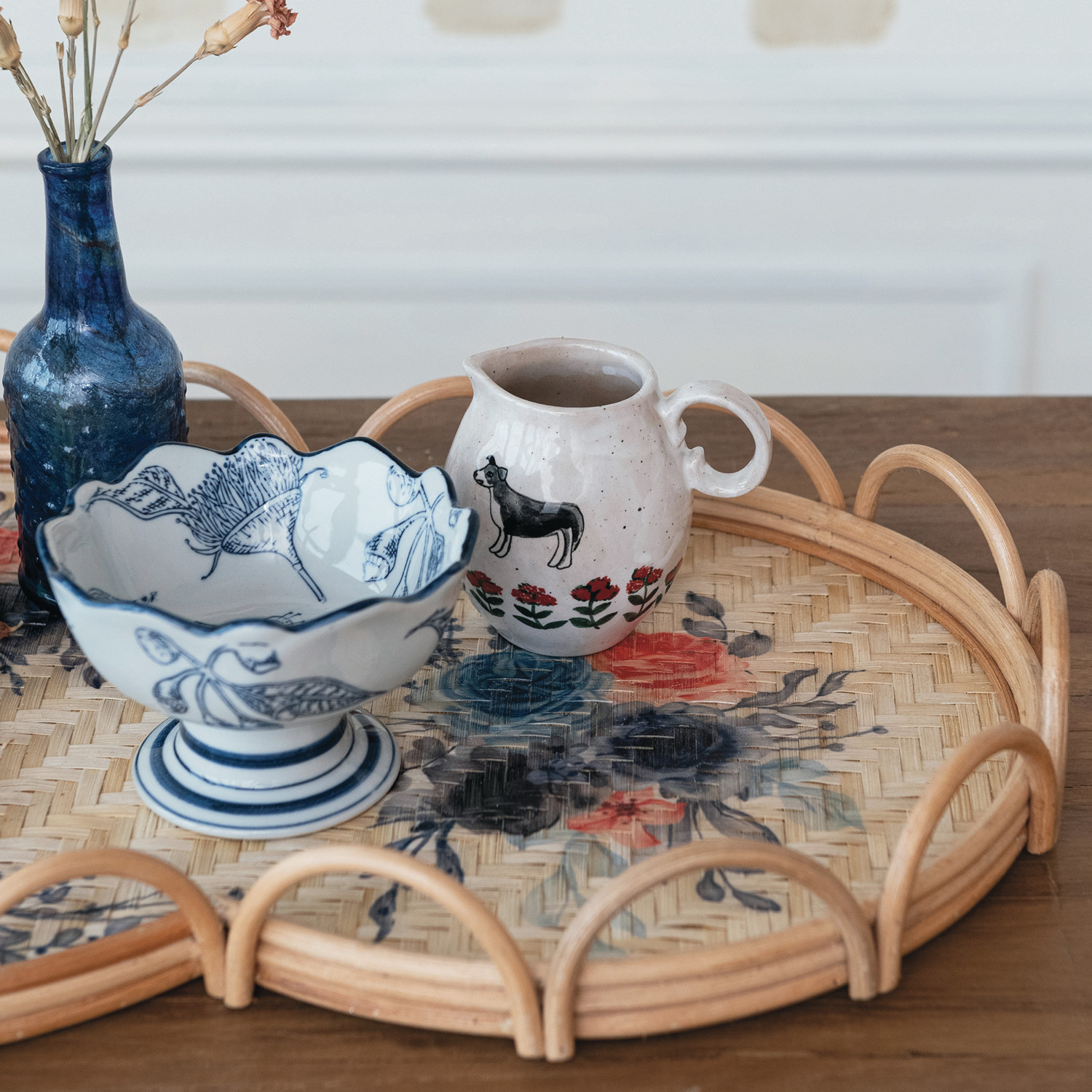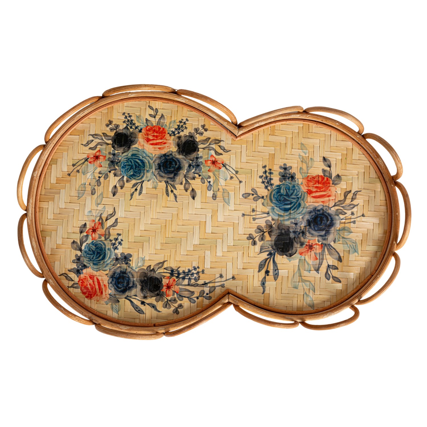 Catalog Name: 23-1/4"L x 15"W x 2-1/4"H Decorative Rattan, Bamboo & MDF Scalloped Tray w/ Printed Florals, Multi Color