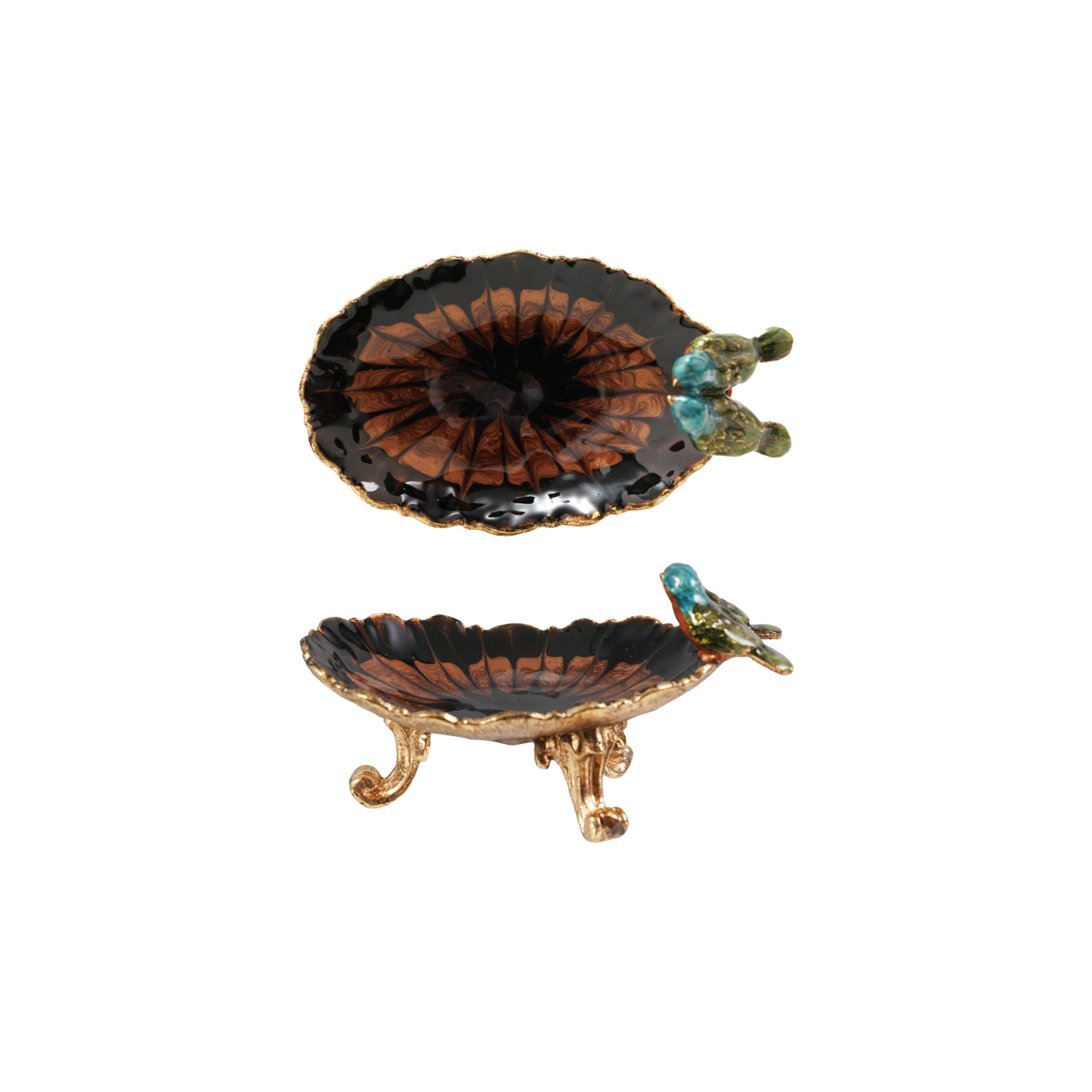 Catalog Name: 4-1/4"L x 2-1/2"W x 2"H Enameled Metal Footed Jewelry Dish w/ 3D Birds, Gold Finish & Multi Color
