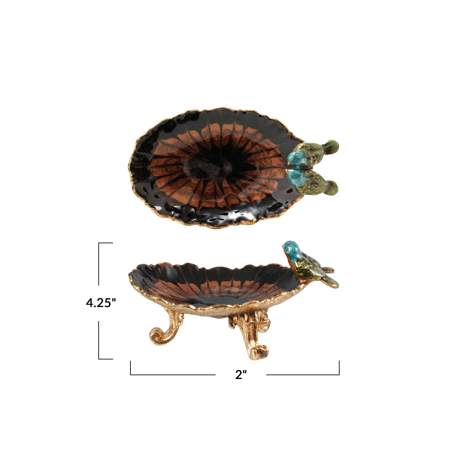 Enameled Metal Footed Jewelry Dish w/ 3D Birds, Gold Finish & Multi Color