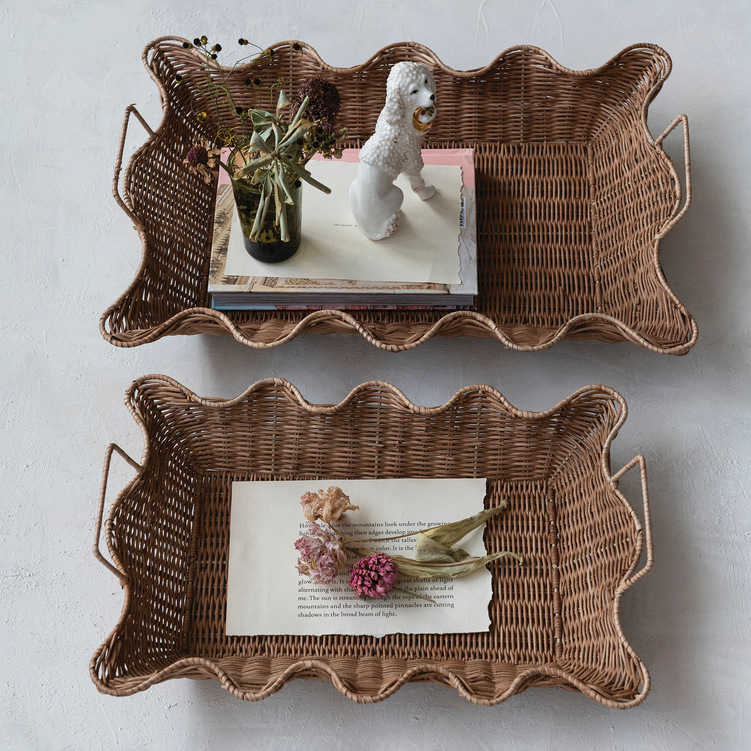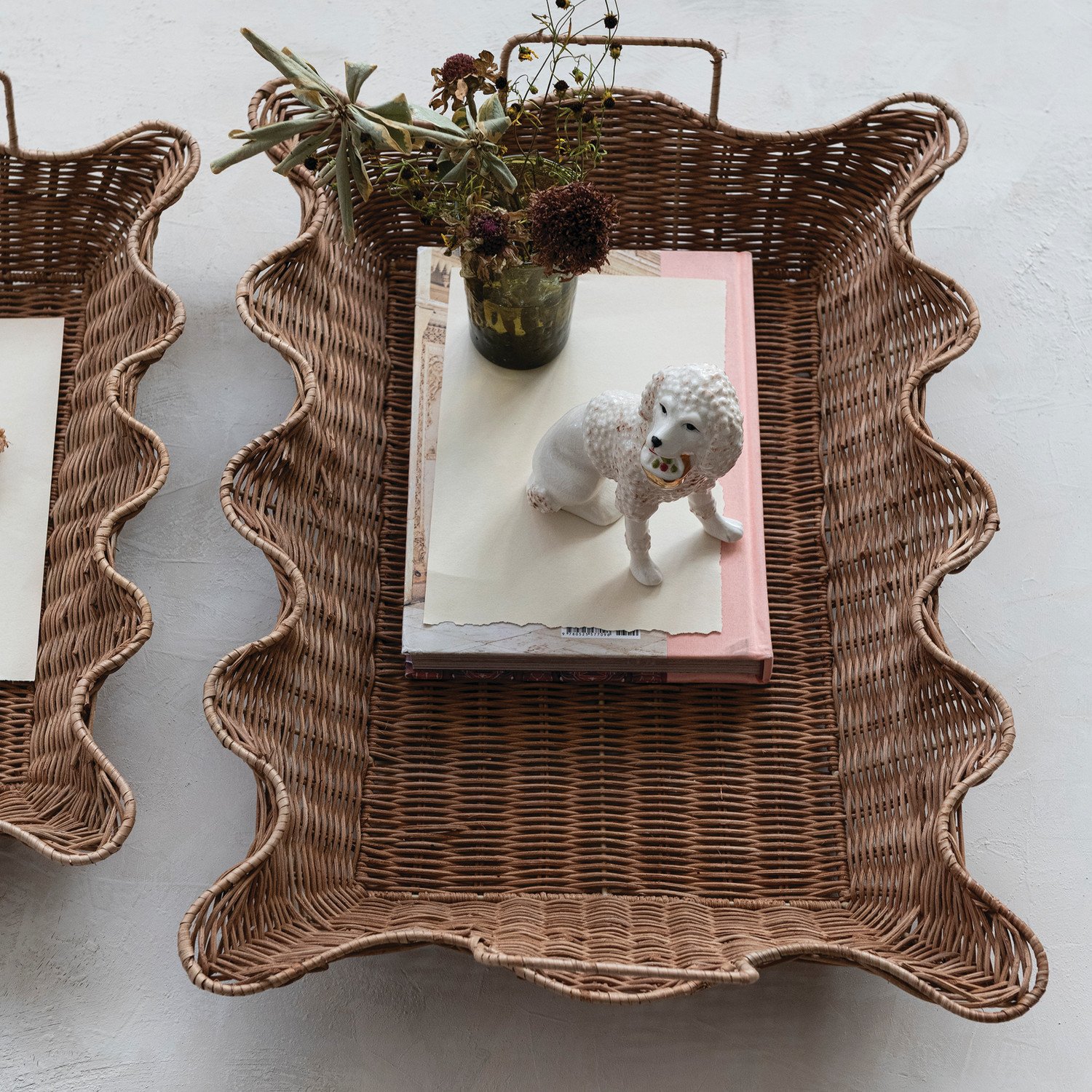 Catalog Name: 23"L x 15-3/4"W x 4-3/4"H & 17-1/2"L x 12-1/4"W x 4-1/2"H Decorative Hand-Woven Rattan Scalloped Nesting Trays w/ Handles, Natural, Set of 2