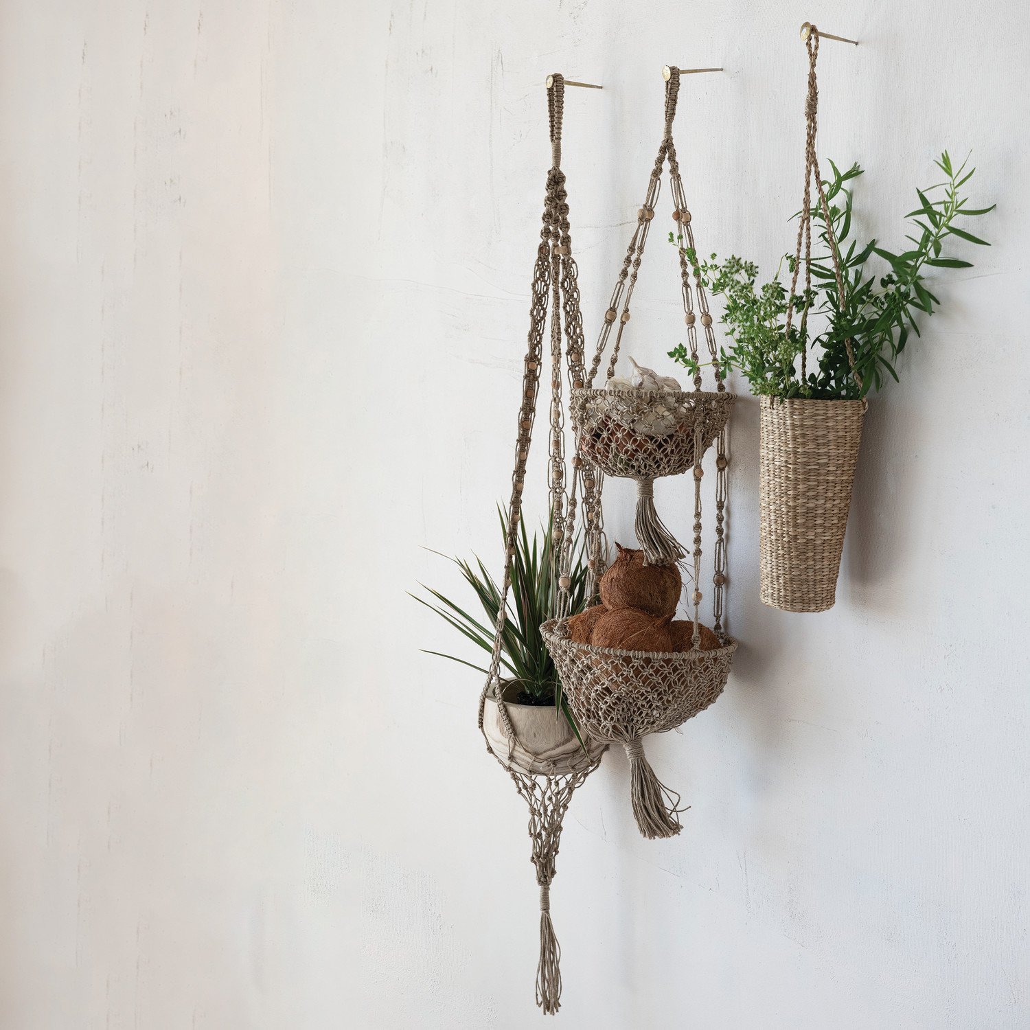 Hand-Woven Jute Macrame 2-Tier Basket with Mango Wood Beads & Tassels, Natural