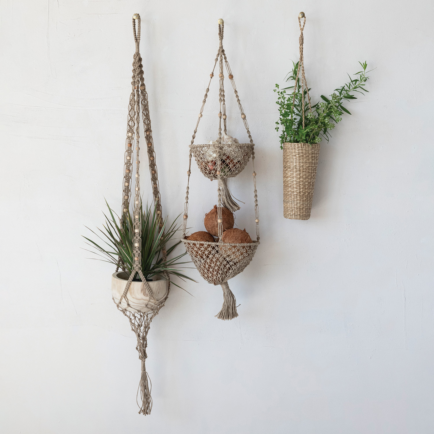 Catalog Name: 12" Round x 41"H Hand-Woven Jute Macrame 2-Tier Basket w/ Mango Wood Beads & Tassels, Natural