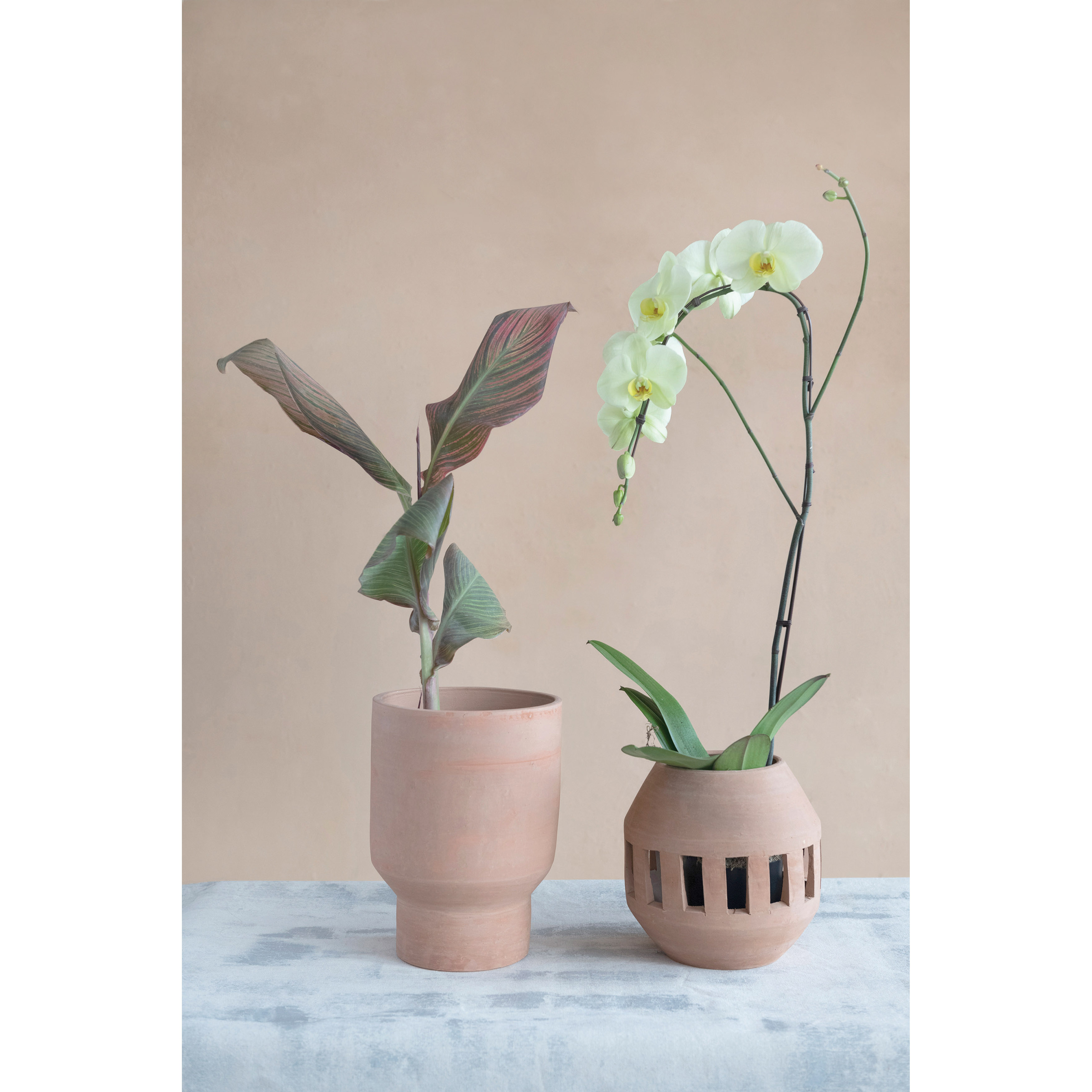 This contemporary terracotta planter features a modern, peekaboo silhouette with hand-carved windows. Round terracotta planter with cutouts in a natural finish. Add a touch of natural beauty to any covered patio or living space with this artistically crafted planter. Made from 100% terracotta.