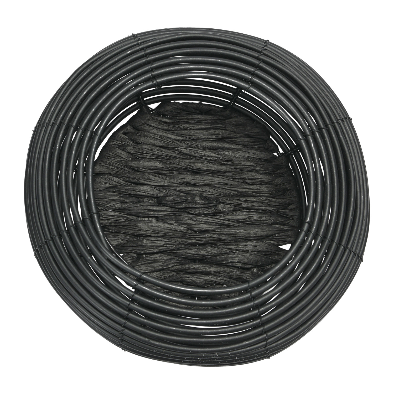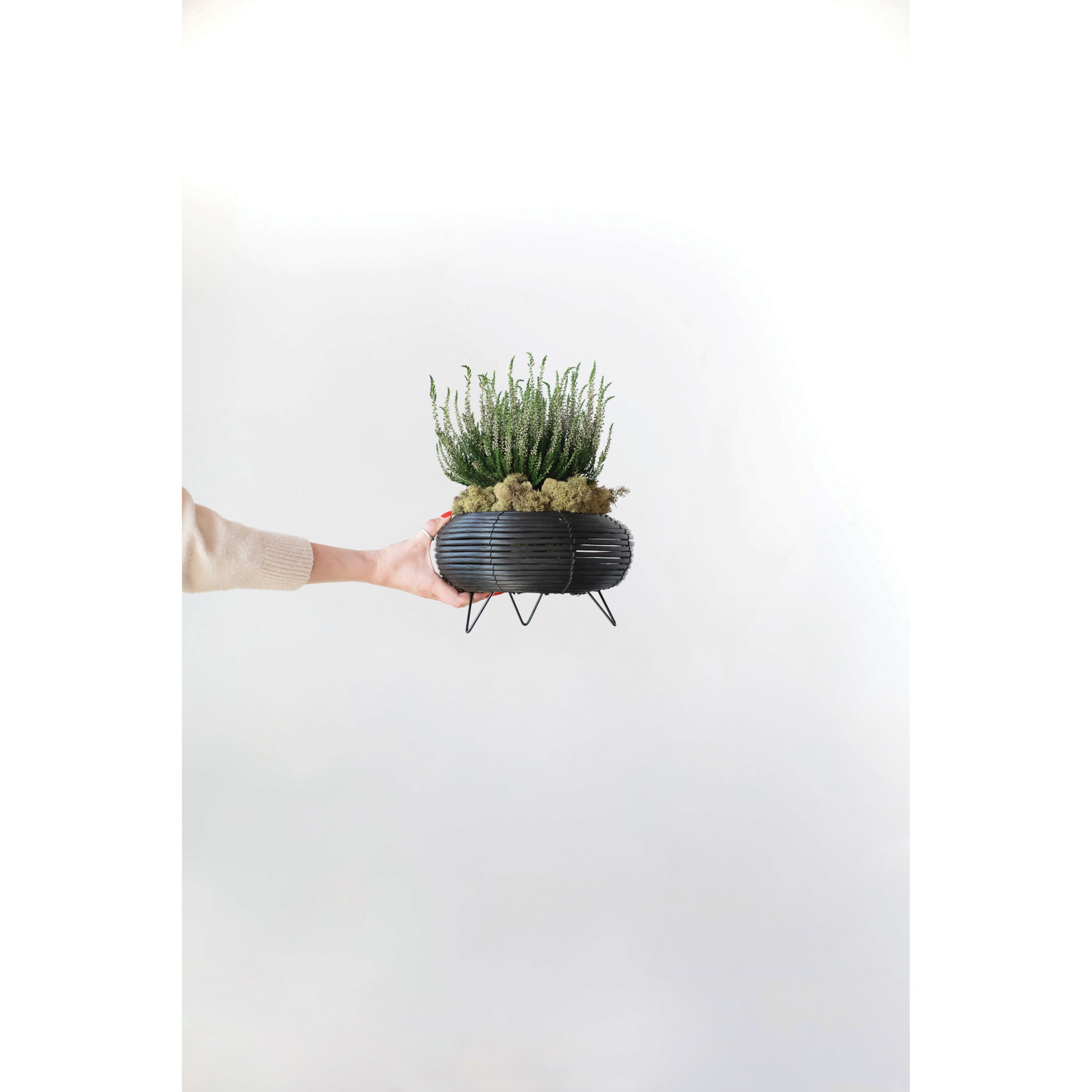 This planter is a sleek and modern piece of decor that features a black plastic body with a rolled design and three metal feet that add some shine and stability. This planter is suitable for any style of home decor, especially for contemporary, industrial, or minimalist look. The planter does not have any drainage holes, so it is best suited for plants that do not require a lot of water or for artificial plants. Made of plastic and metal.