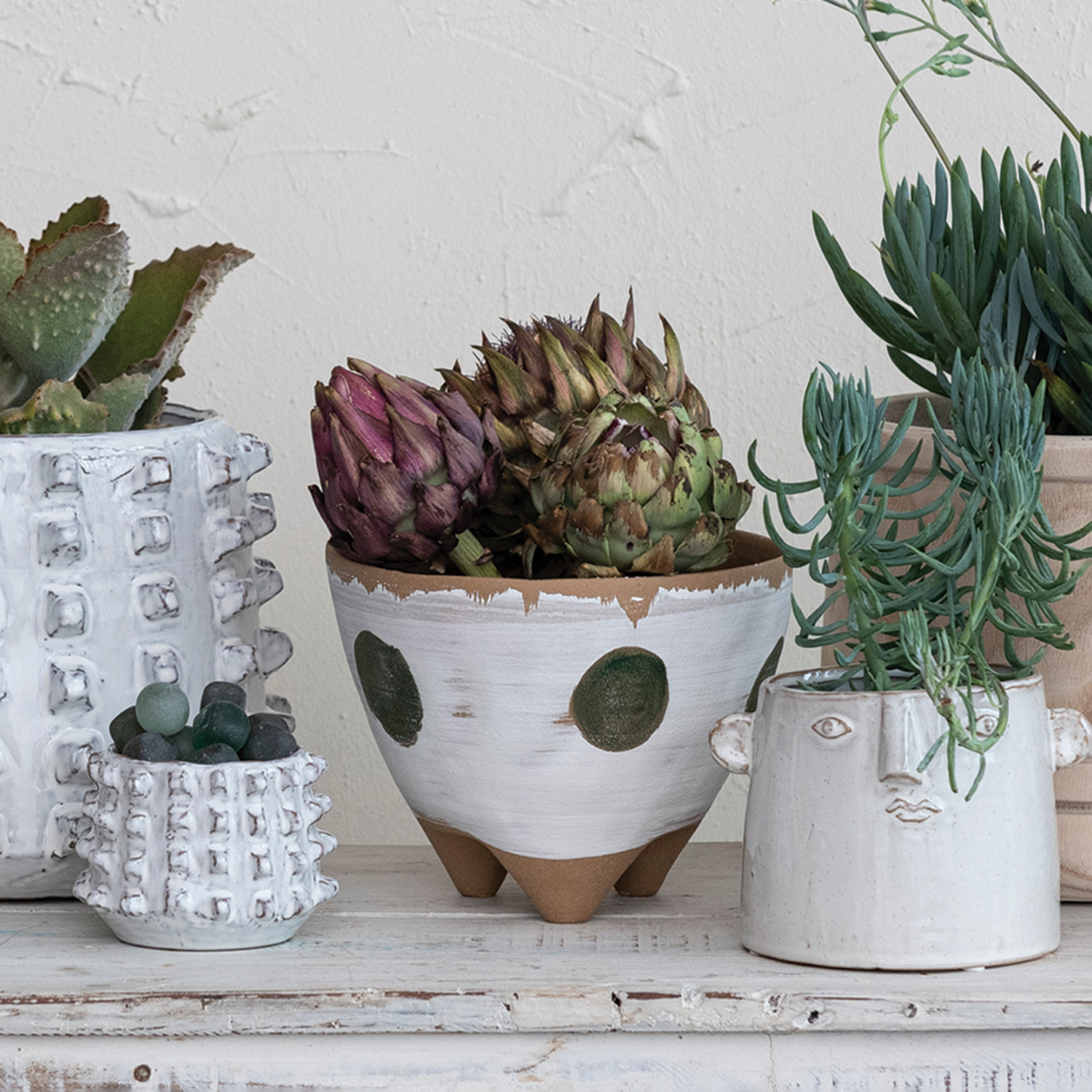 Hand-Painted Stoneware Footed Planter w/ Dots, Matte White, Green & Natural (Each One Will Vary)