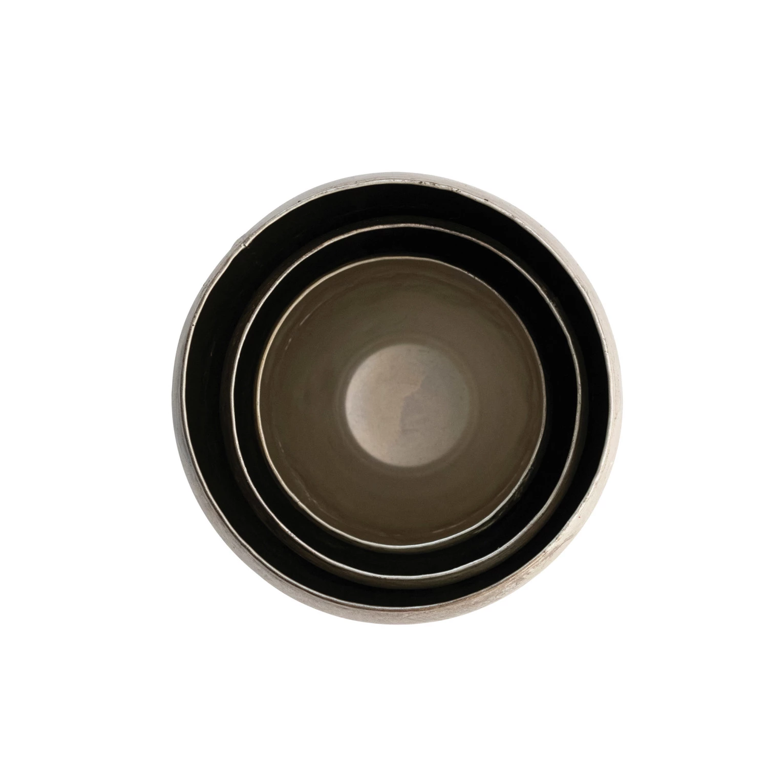 Catalog Name: 7" Round x 6-1/2"H, 6" Round x 5-1/2"H & 5" Round x 4-1/2"H Metal Planters, Distressed Pewter Finish, Set of 3 (Holds 6", 5" & 4" Pots)
