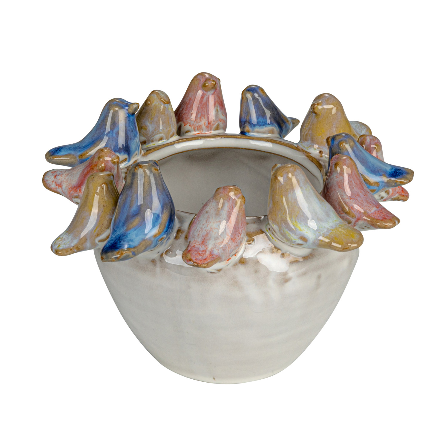 Catalog Name: 5" Round x 3-1/4"H Stoneware Planter w/ 3D Birds on Rim, Reactive Glaze, Multi Color (Each One Will Vary)
