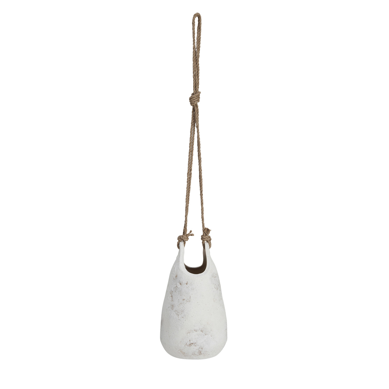 Add some charm and elegance to the space with this Hanging Stoneware Planter with Jute Rope Hanger, Distressed Volcano Finish, White. This beautiful planter is made of high-quality stoneware that has a distressed volcano finish that creates a textured and rustic look. The white color adds a touch of brightness and simplicity to the planter. It has a round shape and a drainage hole that can hold a 7-inch pot. Use it to display plants or flowers indoors or outdoors. It comes with a jute rope hanger that hangs it from a ceiling, a wall, or a hook. It measures 7.25 inches in diameter and 12.25 inches in height, making it a perfect size for any space. Each planter is unique and will vary slightly in color and shape. Whether create a farmhouse, garden, botanical, coastal, or boho vibe in the space, this planter will achieve it. It is not only functional but also decorative. It will make the space stand out and impress the guests.