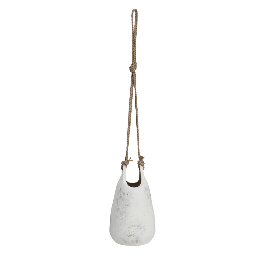 Catalog Name: 7-1/4" Round x 12-1/4"H Hanging Coarse Stoneware Planter w/ Jute Rope Hanger, Volcano Finish, White (Each One Will Vary)