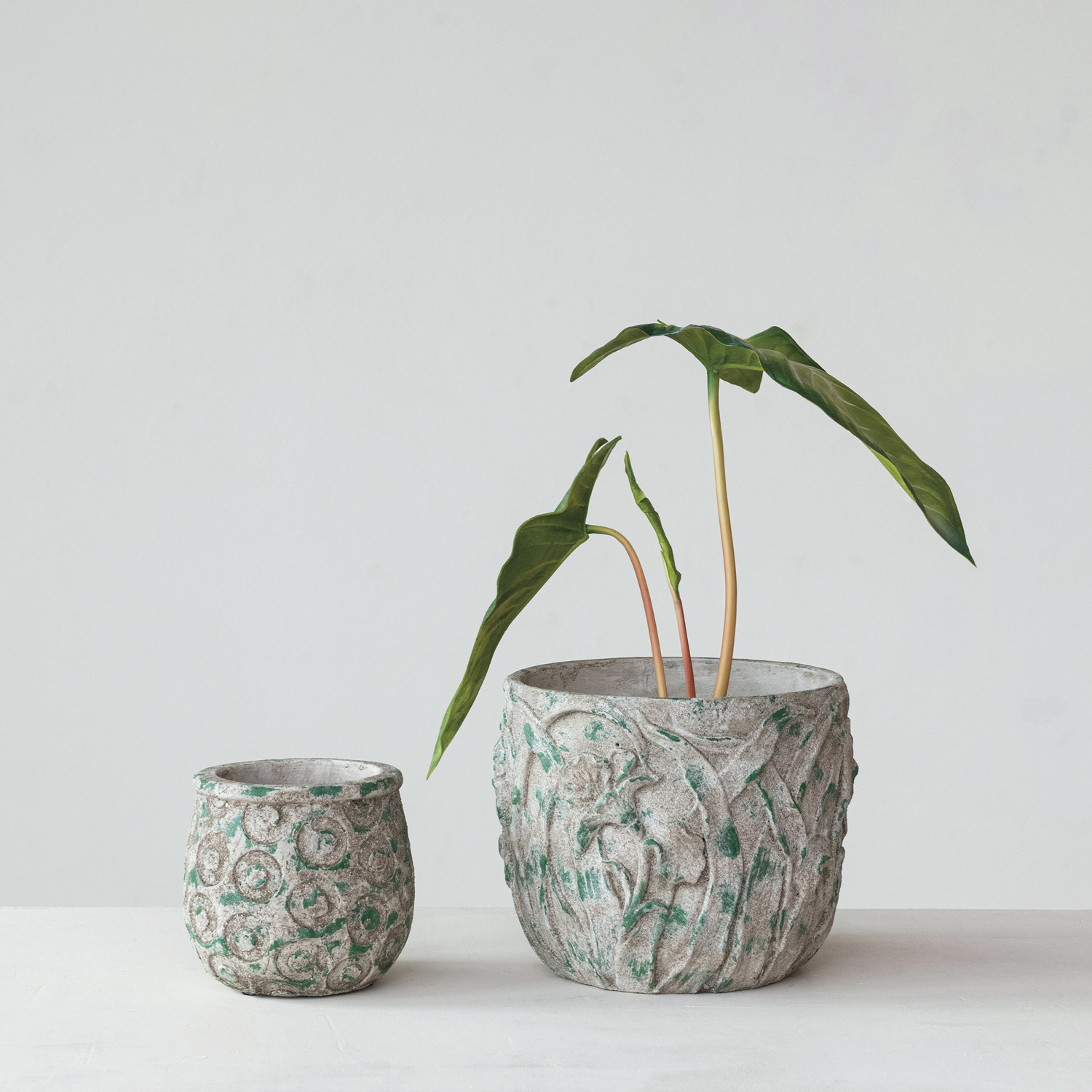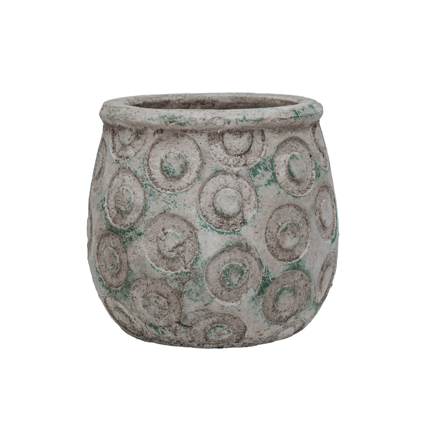 Catalog Name: 6-1/2" Round x 5-3/4"H Terra-cotta Planter w/ Debossed Circles, Distressed Green (Holds 4" Pot)