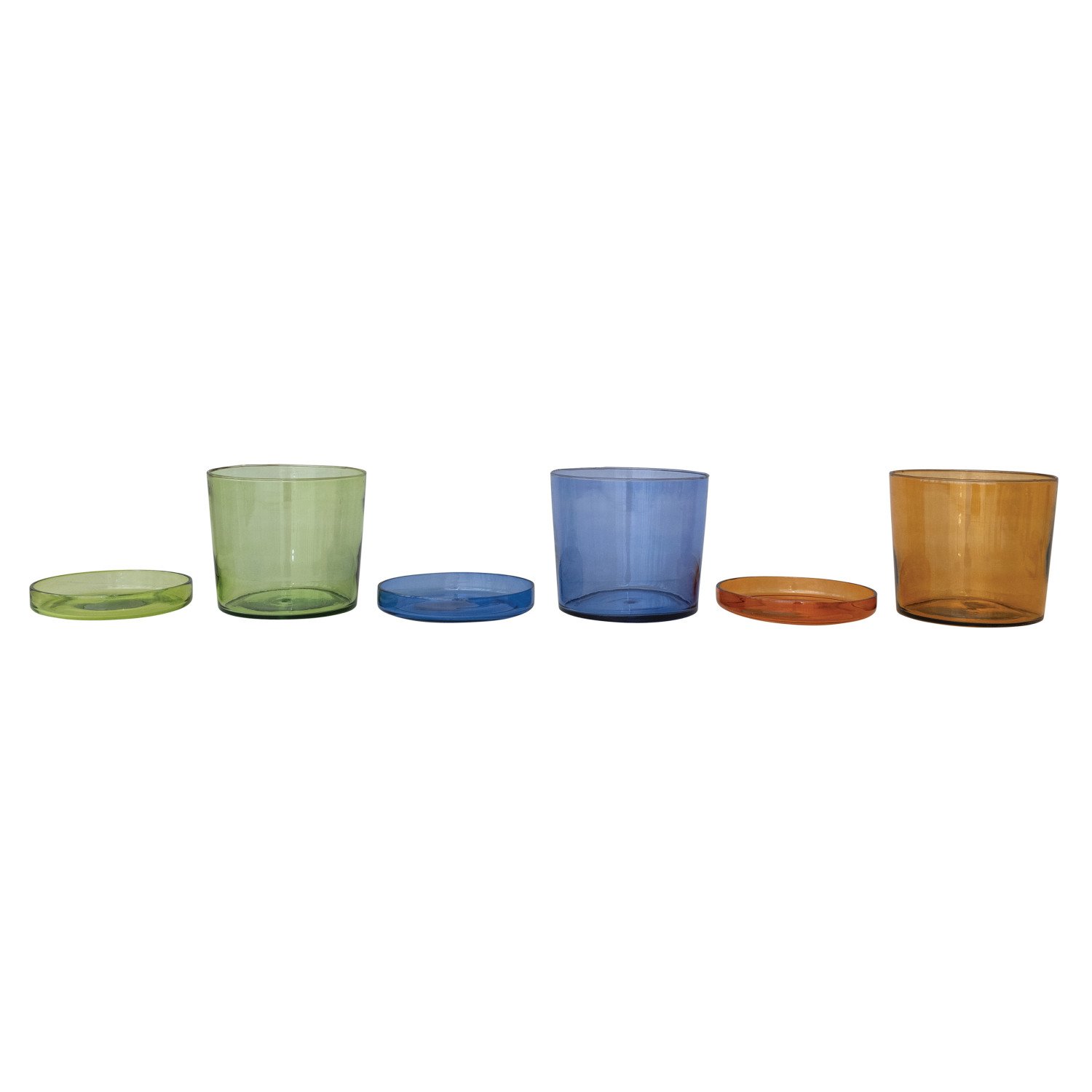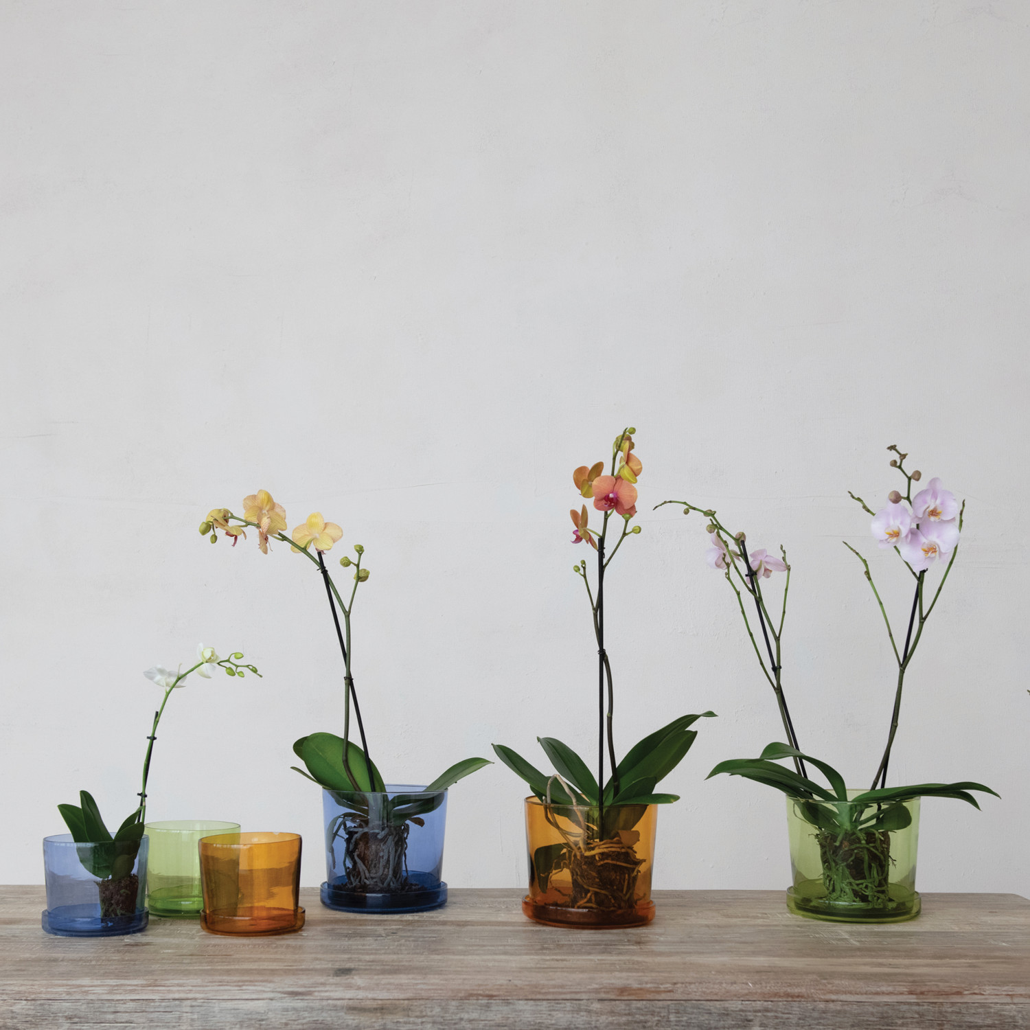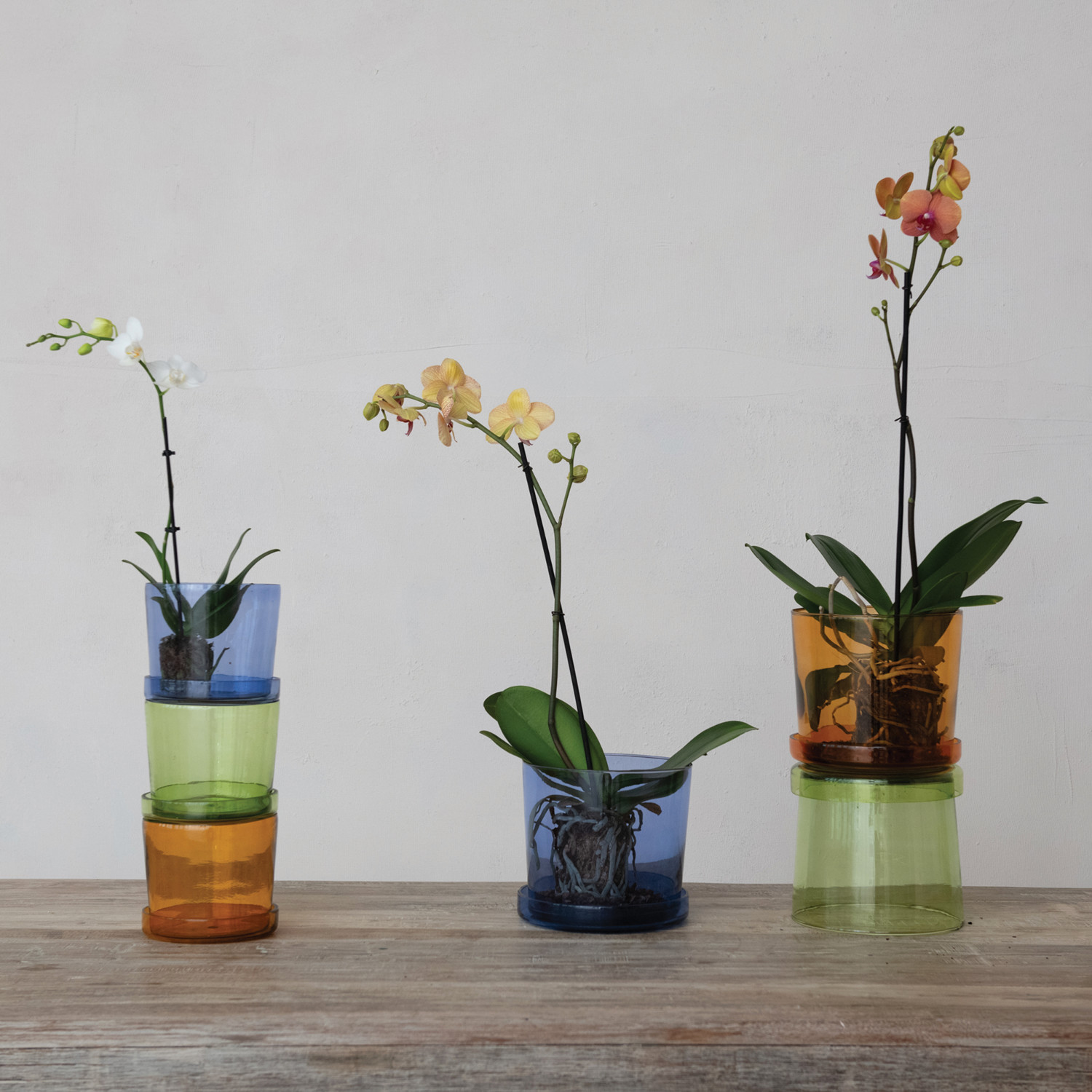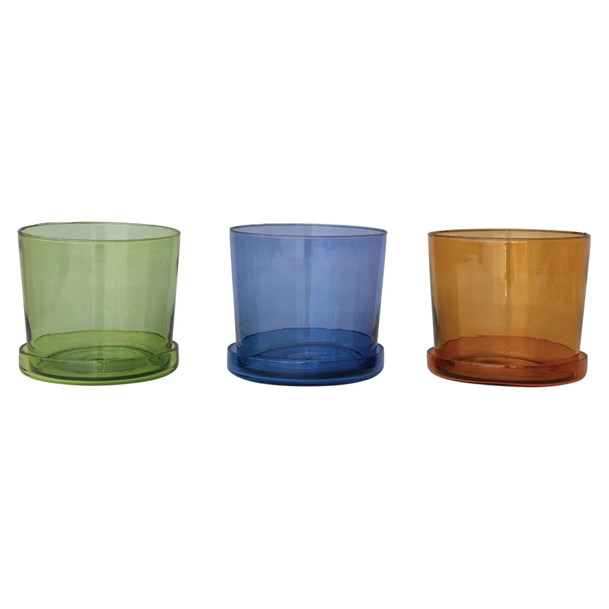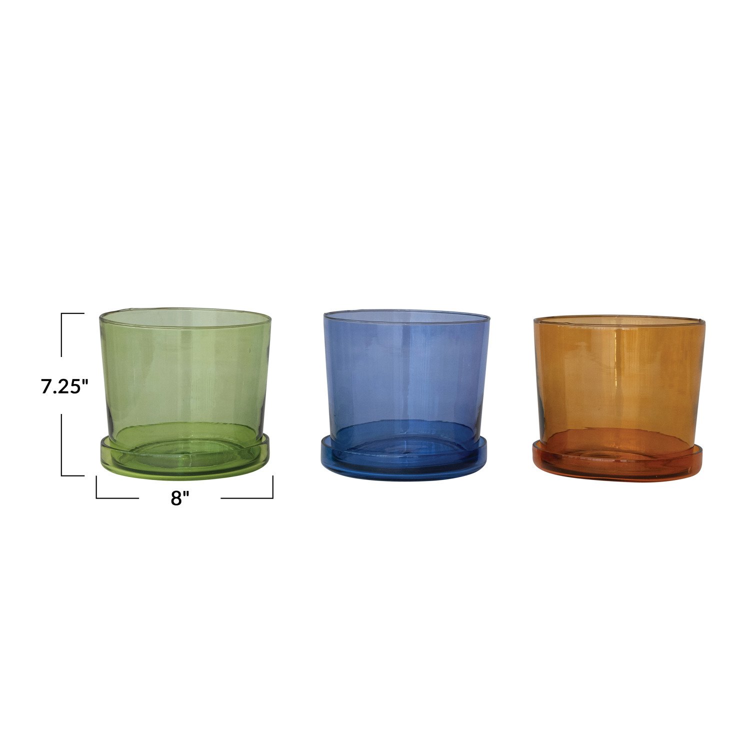 Hand-Blown Recycled Glass Planter w/ Saucer, Set of 2, 3 Colors (Holds 7" Pot)