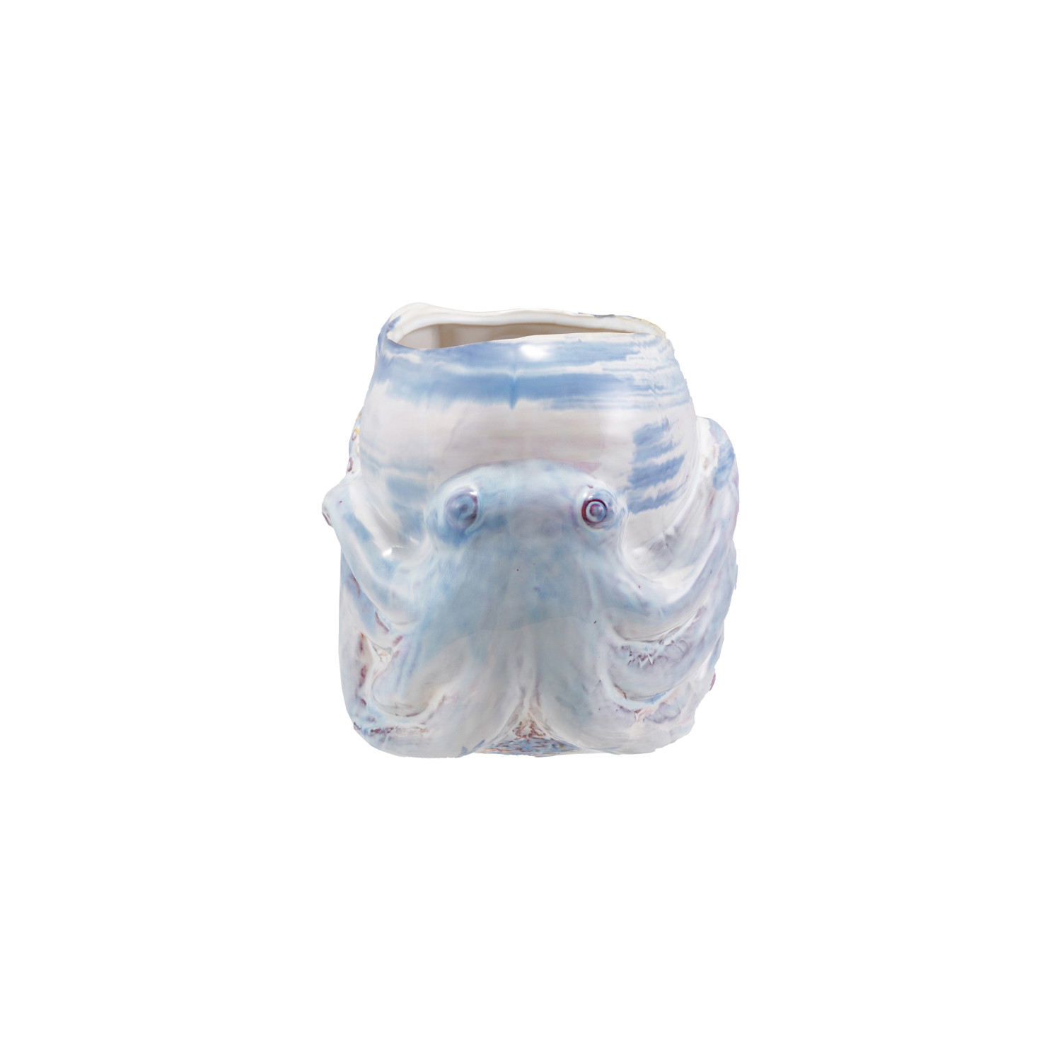 Catalog Name: 8-3/4"L x 8"W x 8-1/4"H Stoneware Planter w/ Octopus, Reactive Glaze, White & Blue (Holds 4" Pot) (Each One Will Vary)