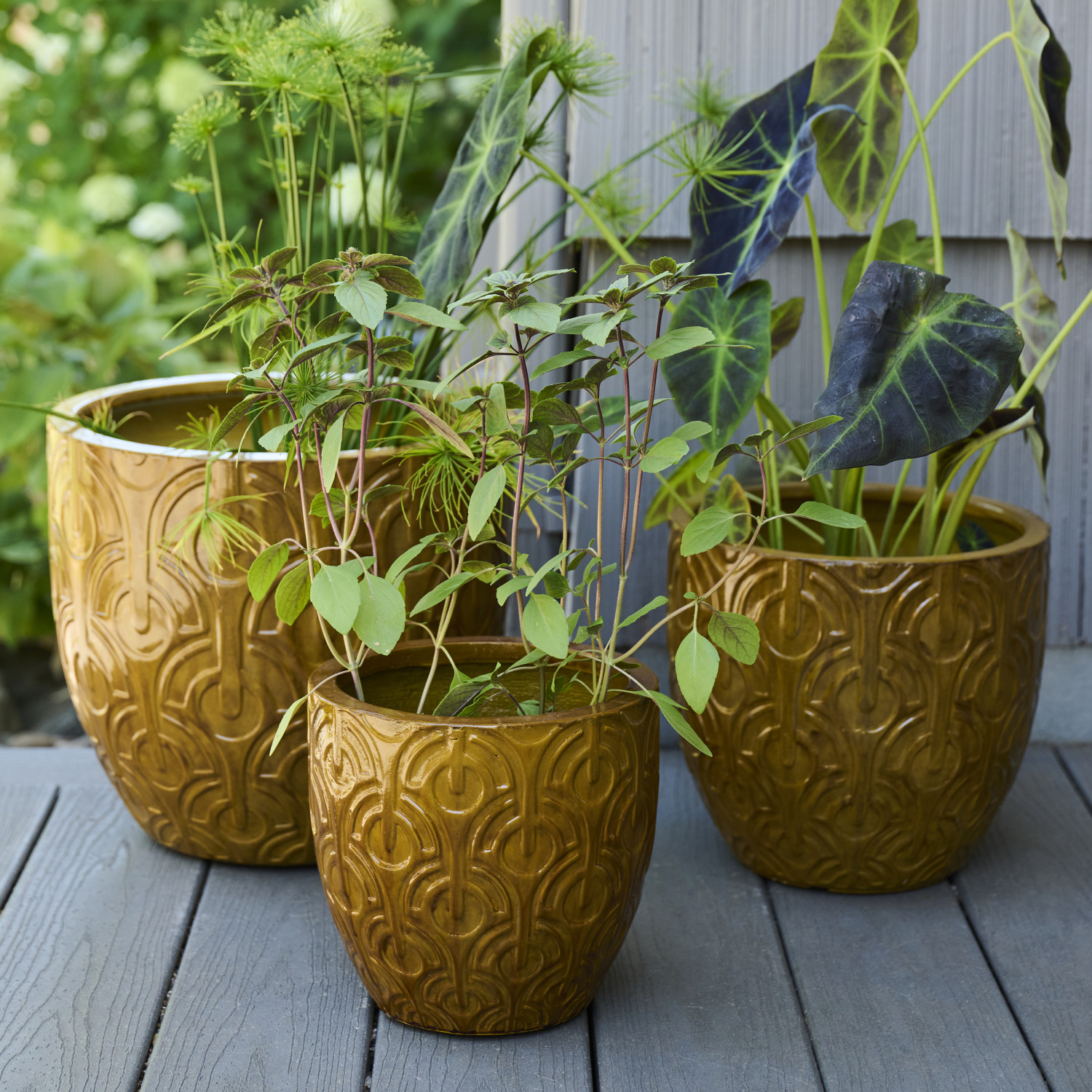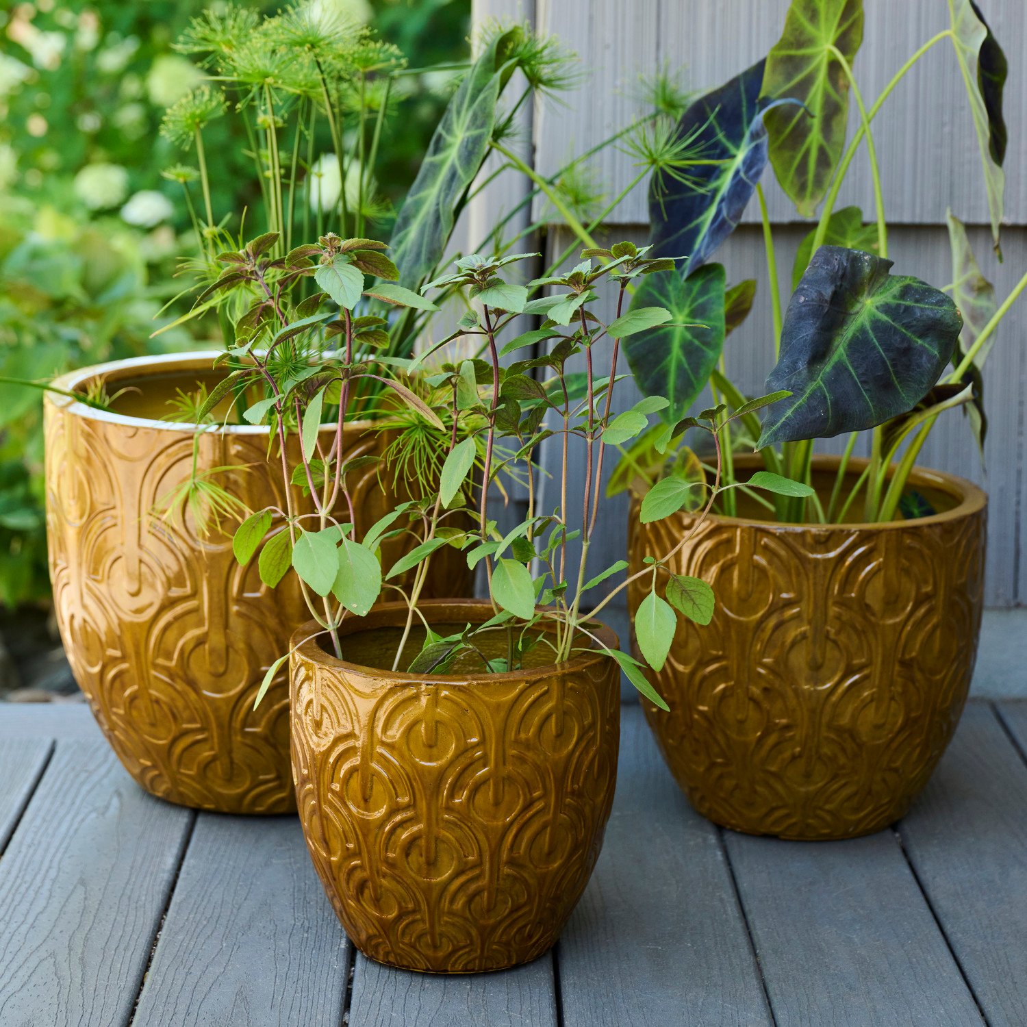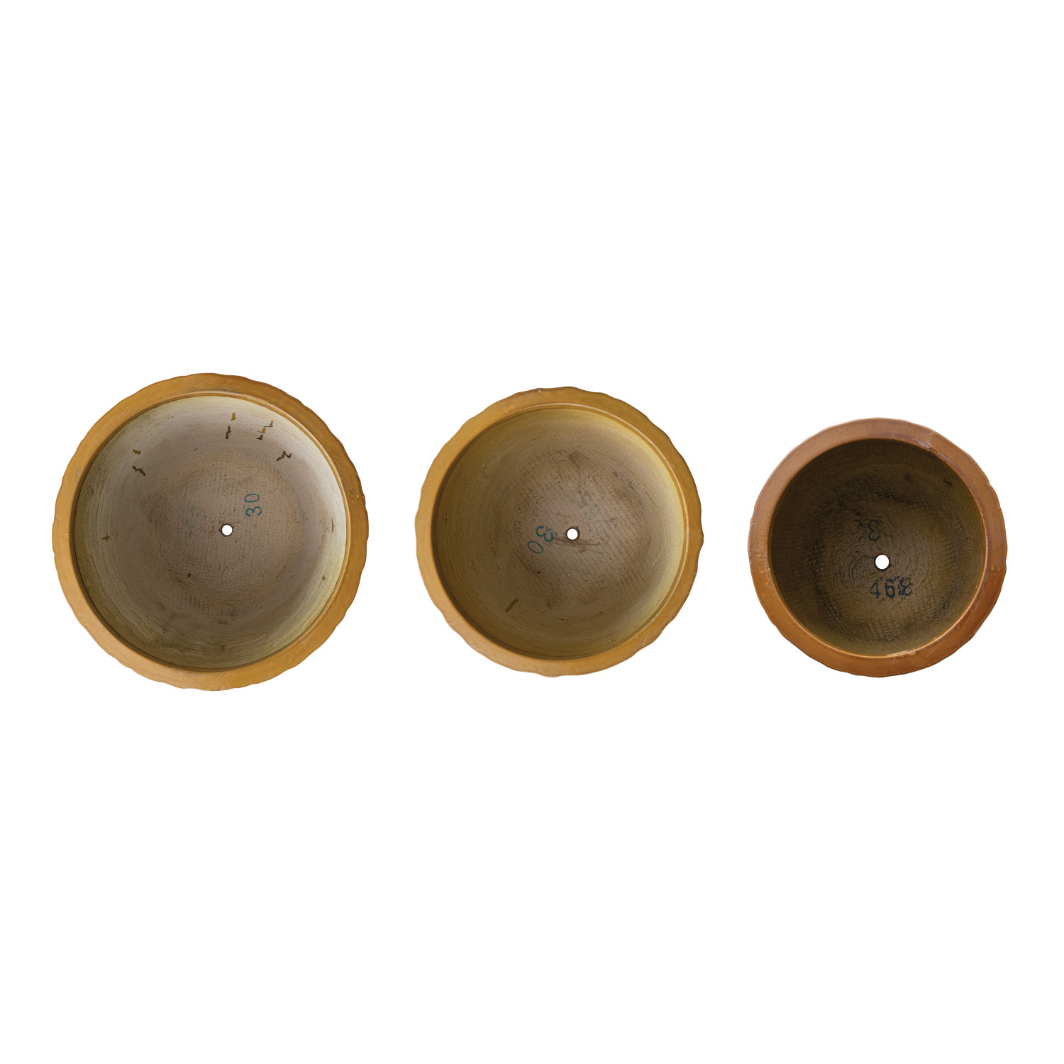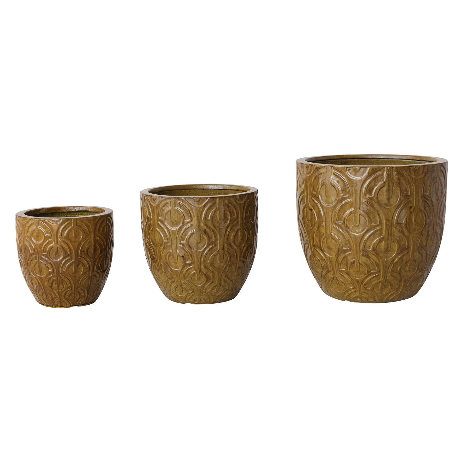 Catalog Name: 14-1/2" Round x 13"H, 11-1/2" Round x 10-1/4"H & 9" Round x 8-1/2"H Embossed Lightweight Shatter-Resistant Indoor/Outdoor Planters w/ Drainage Hole, Mustard Color, Set of 3 (Holds 12", 10" & 7" Pots)