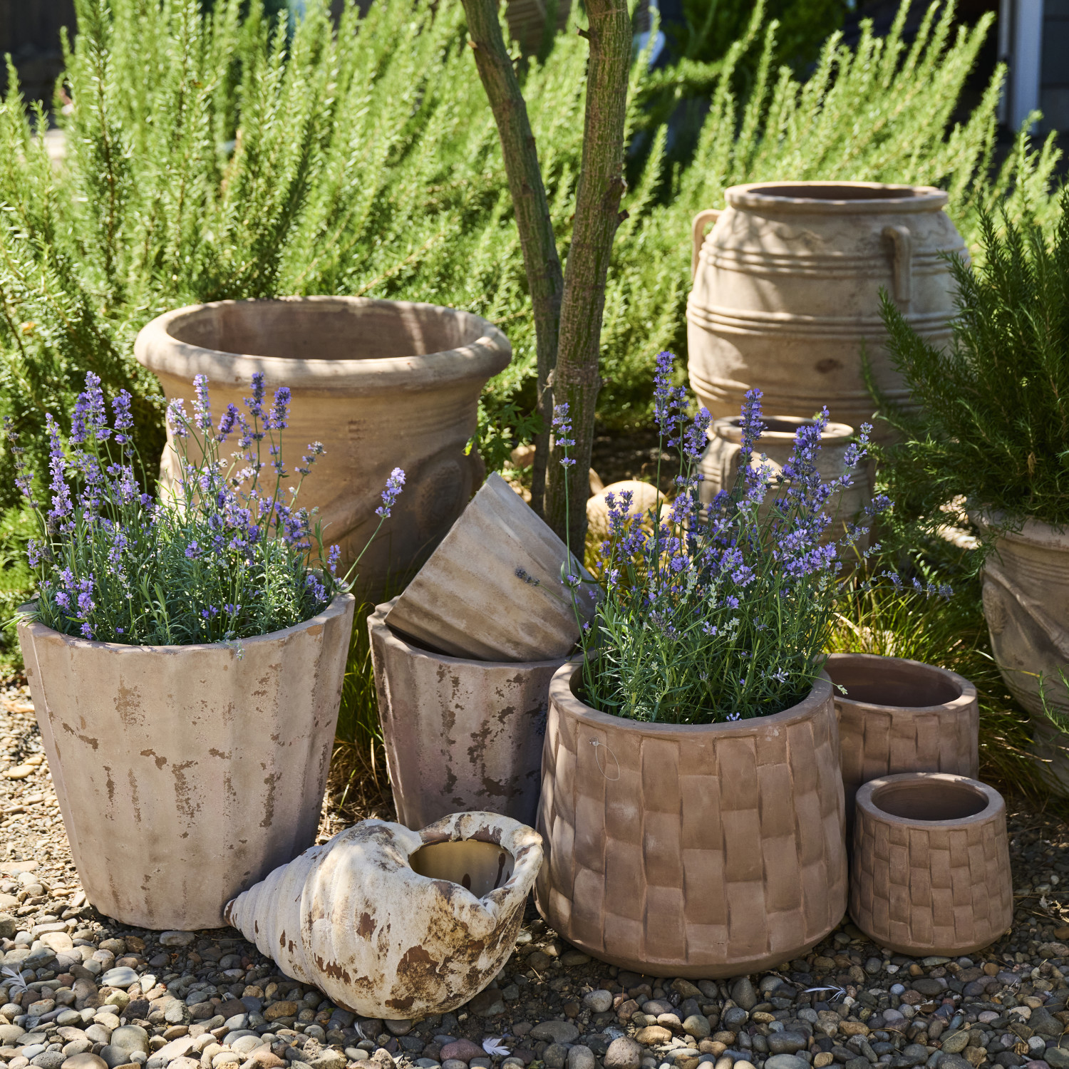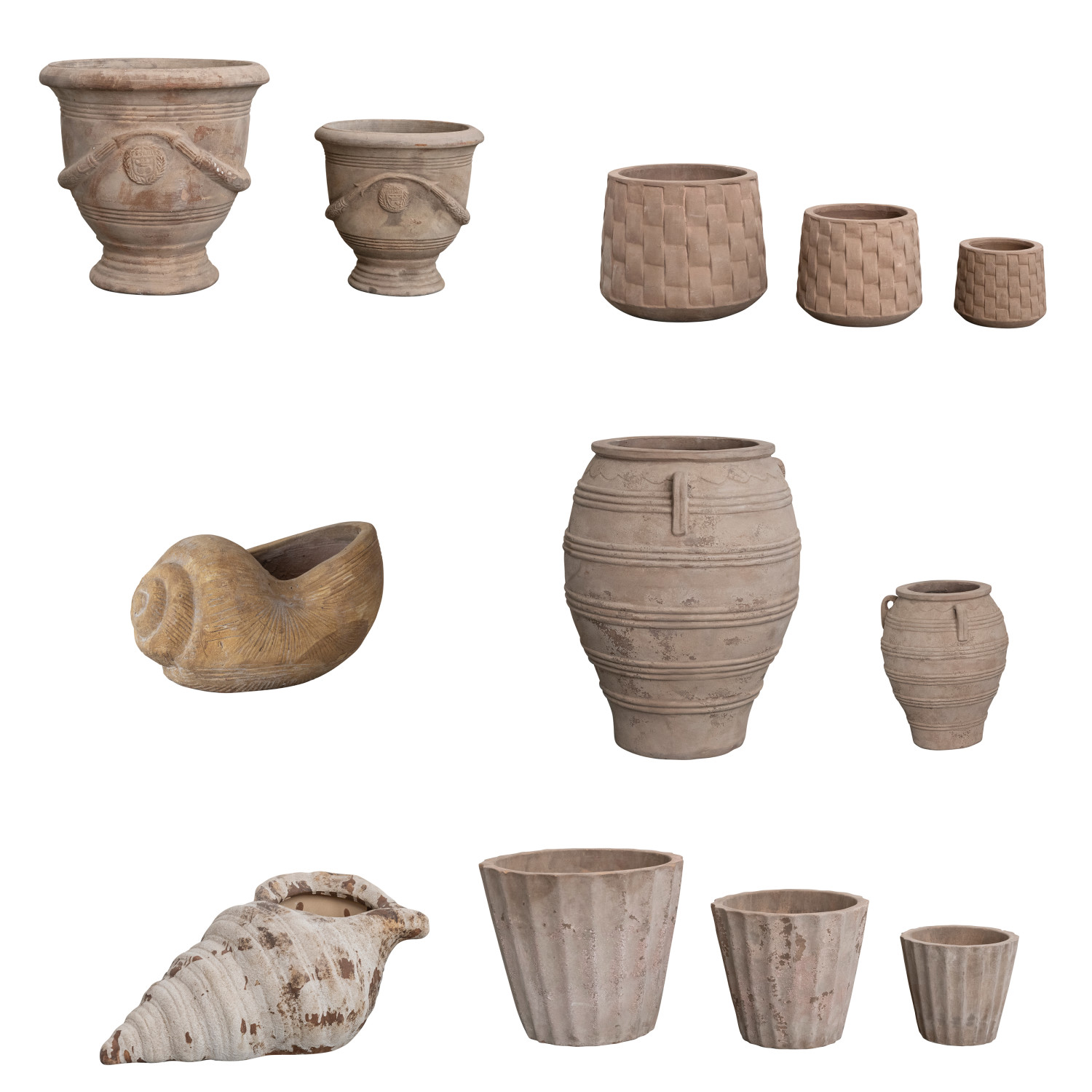 Catalog Name: Terra-cotta Pot Pallet: Includes 8 Sets of Pots & 4 Shell Shaped Planters, Truck Ship (Each One Will Vary) (24 Individual Pieces)