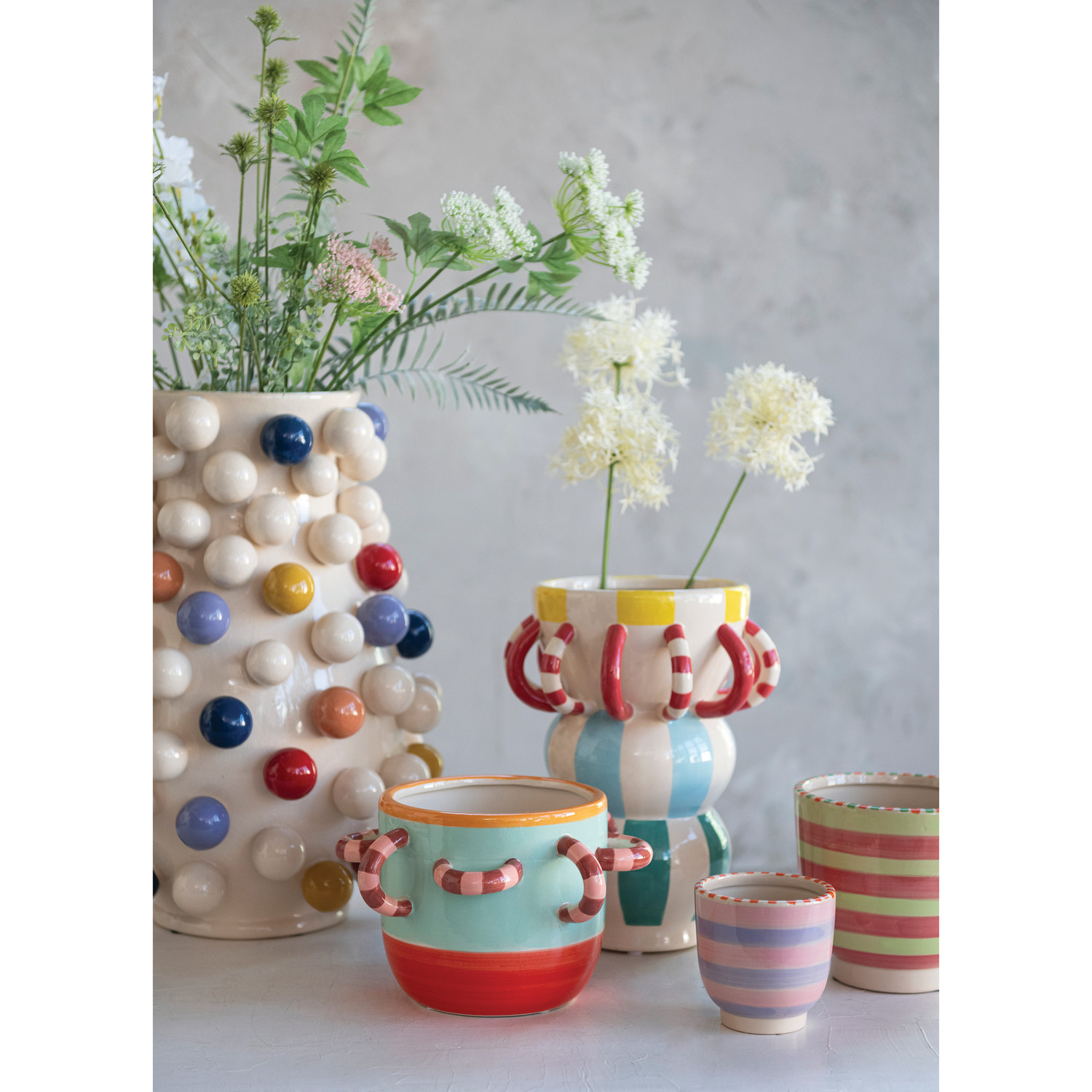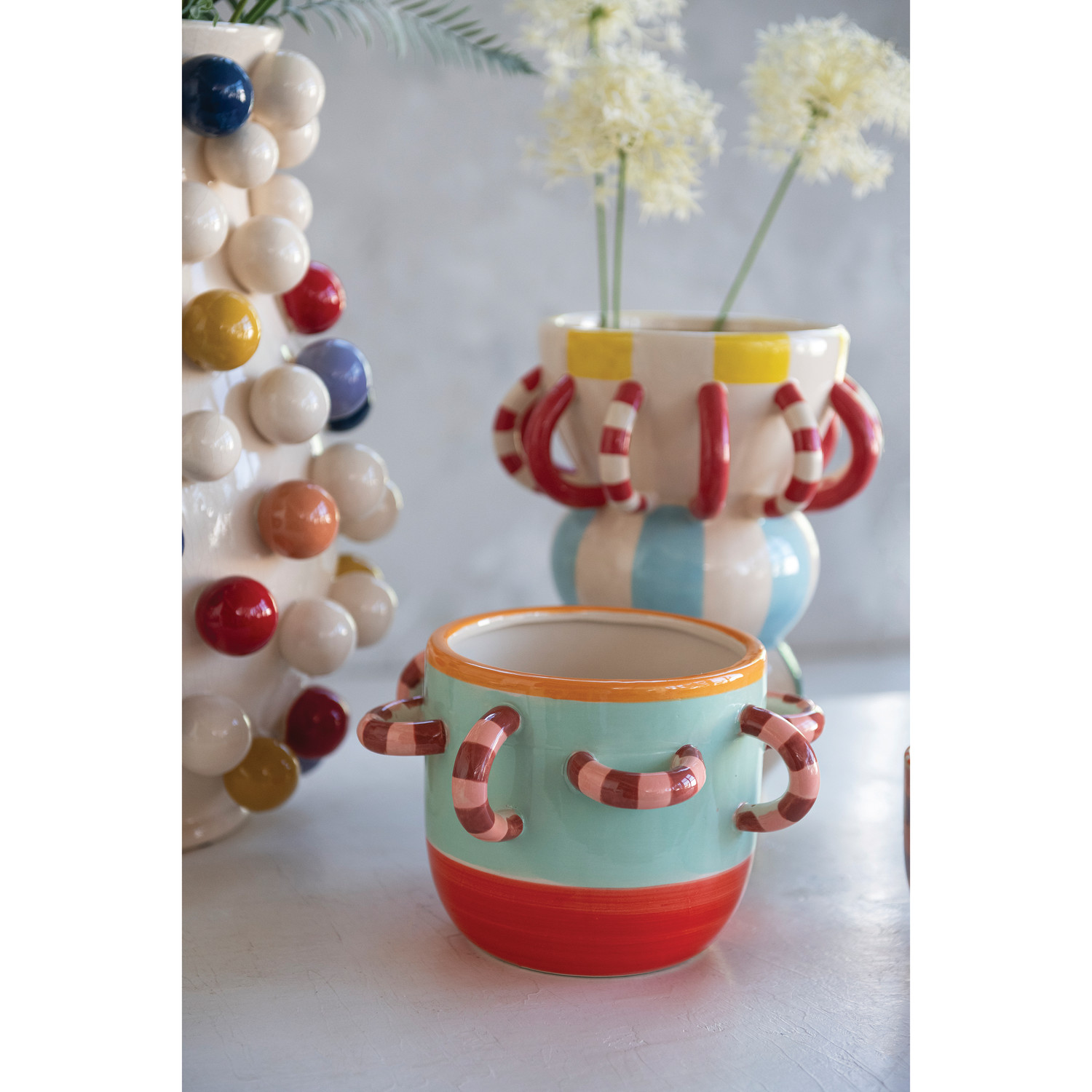 Catalog Name: 9-1/4" Round x 6"H Hand-Painted Stoneware Planter w/ Striped 3D Loops, Multi Color (Holds 5" Pot)