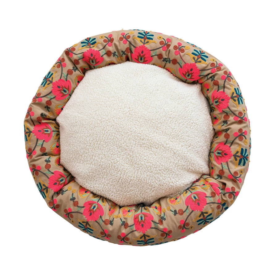 Catalog Name: 24" Round x 6"H Cotton Embroidered & Sherpa Pet Bed w/ Pattern & Washable Cover, Multi Color
